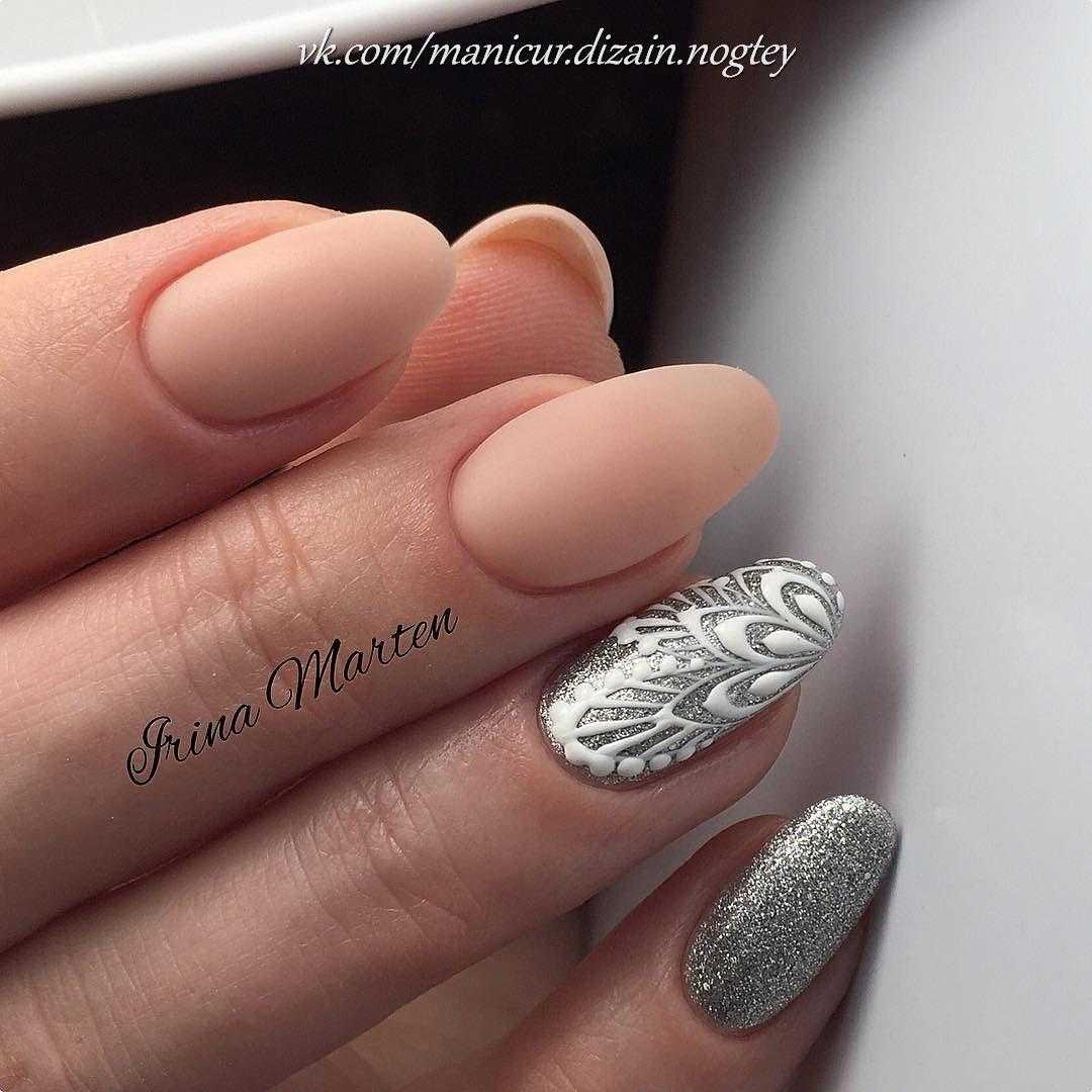Как правило, такой вид дизайн популярен среди приверженок нюдового покрытия. Серебристый цвет отлично сочетается со многими оттенками. Наиболее актуальными на данный сезон являются:
