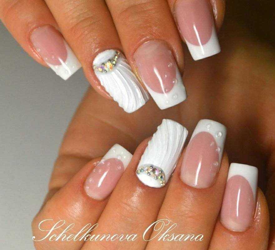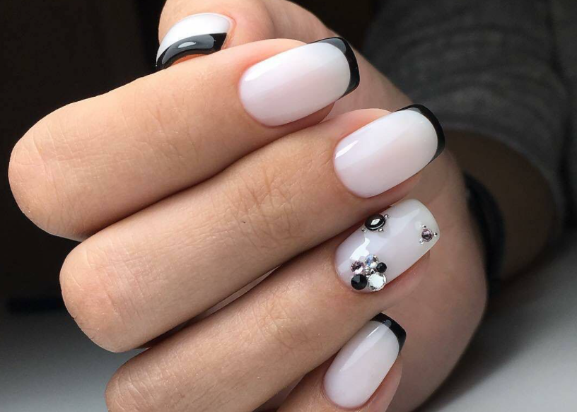 - французский маникюр — неширокая белая полоска по краю ногтя;