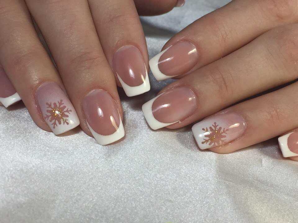 Не стоит думать, что новогодний маникюр предполагает обилие блеска, расписных картин и буйство красок. Этот дизайн можно вполне выполнить на небольшую длину пластины и в светлых тонах. Чтобы ногти не были скучны, его дополняют росписью, добавляют блеск или стразы, все по желанию клиента.