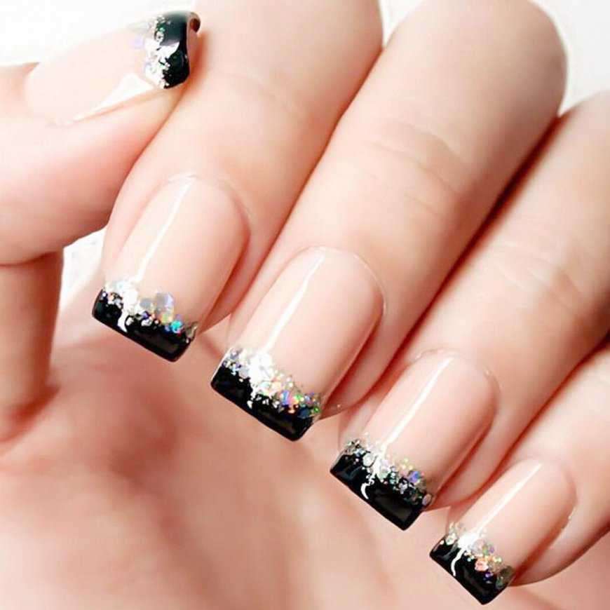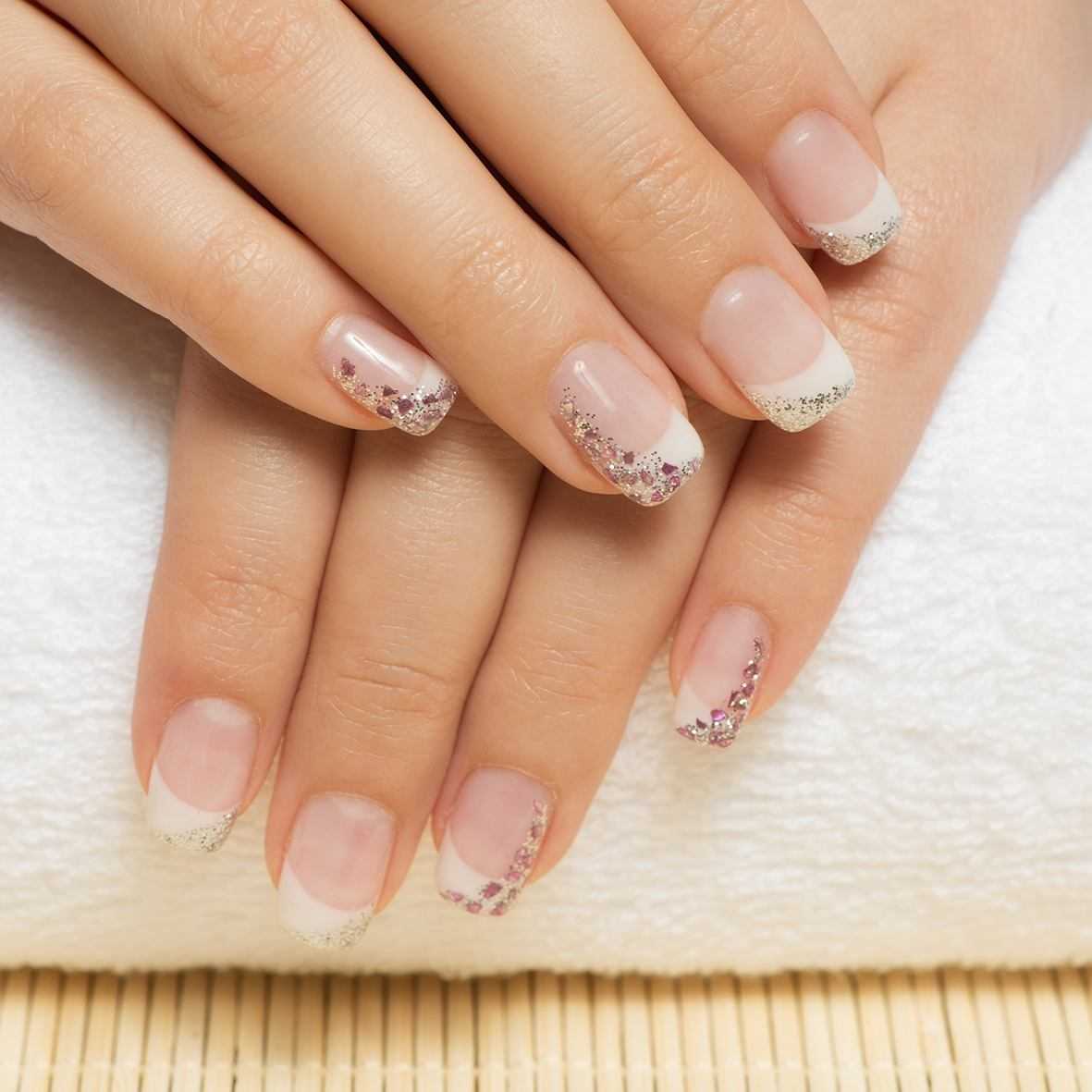 - френч с блестками — сияющие частицы можно заложить в основу или в финишное покрытие.