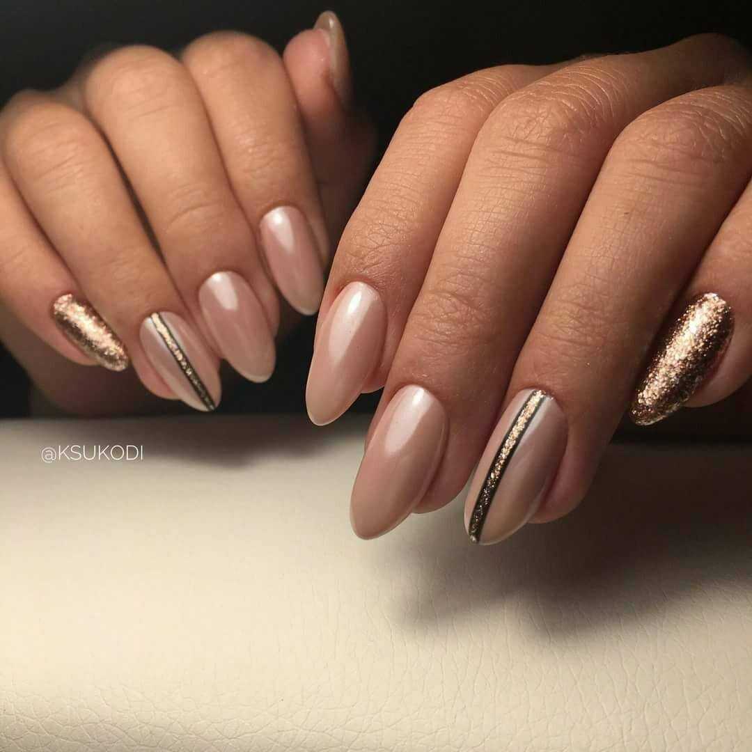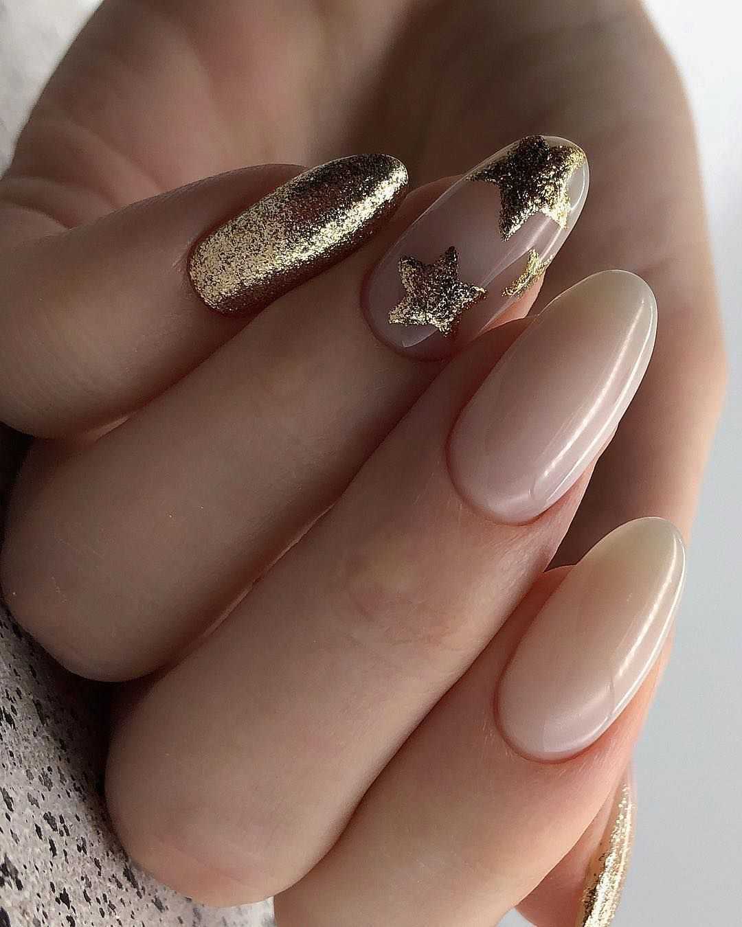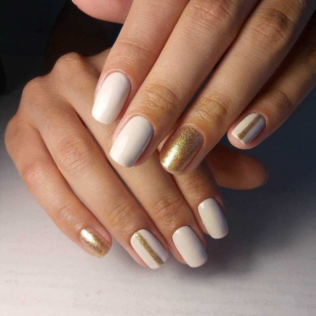 Сделать бежевый маникюр изысканным и торжественным можно при помощи золотого оттенка. Бежево-золотой маникюр подойдет для праздничного новогоднего вечера, торжественного вечера по случаю какого-либо праздника. Однако, для того чтобы ногти смотрелись изящно не стоит перебарщивать с золотым цветом. Его излишек сделает маникюр безвкусным. При создании праздничного бежево-золотого маникюра можно использовать следующие идеи: