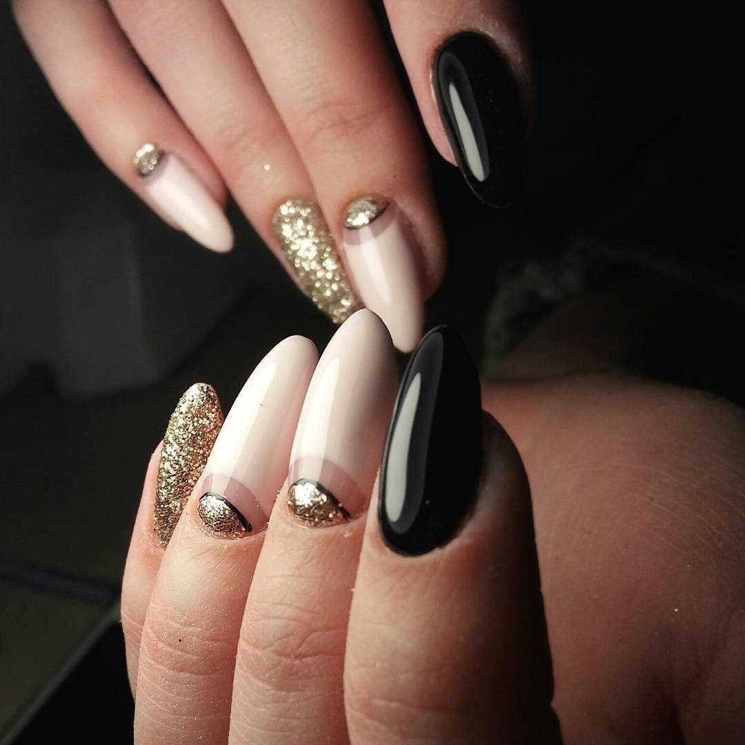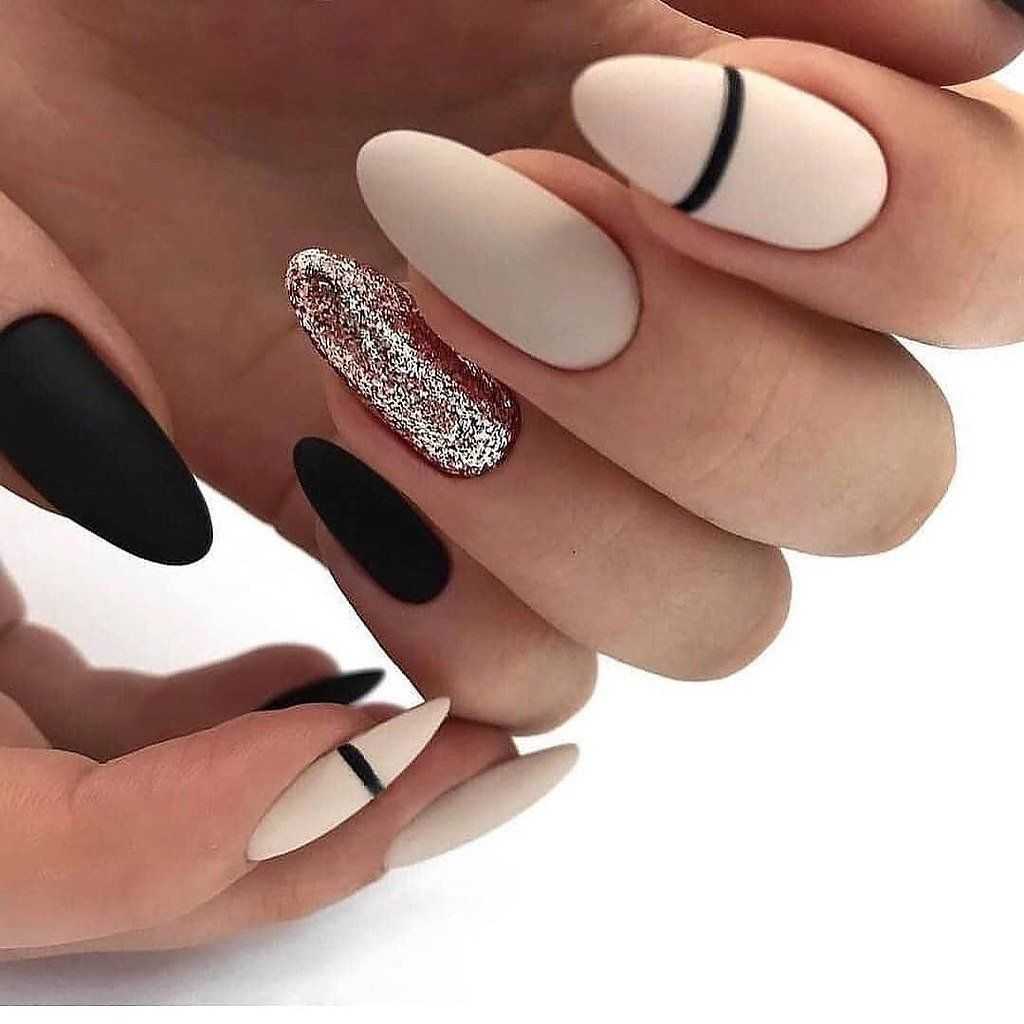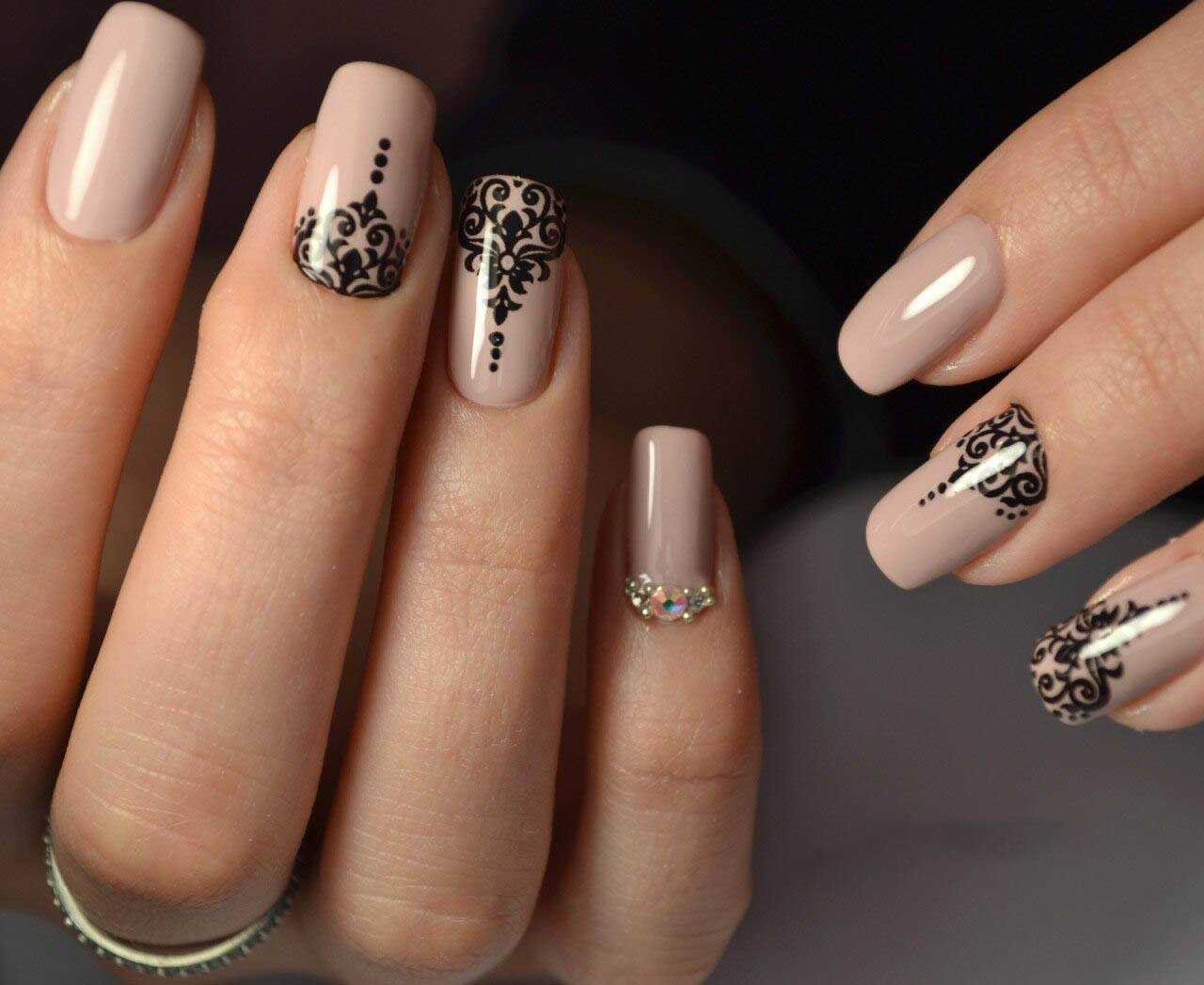 - актуален бежевый маникюр с черными блестками или эффектно декорированный стразами этого цвета.