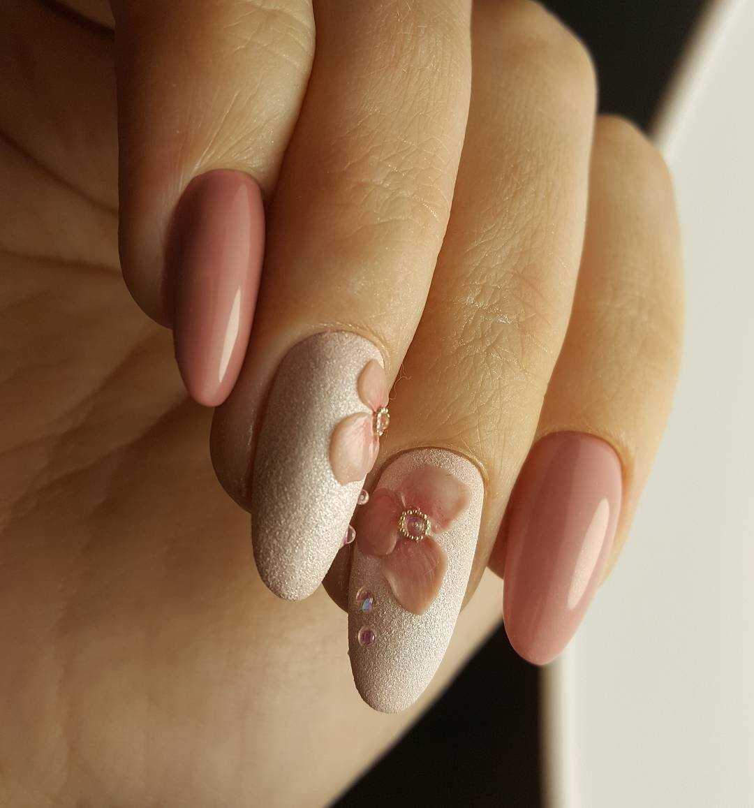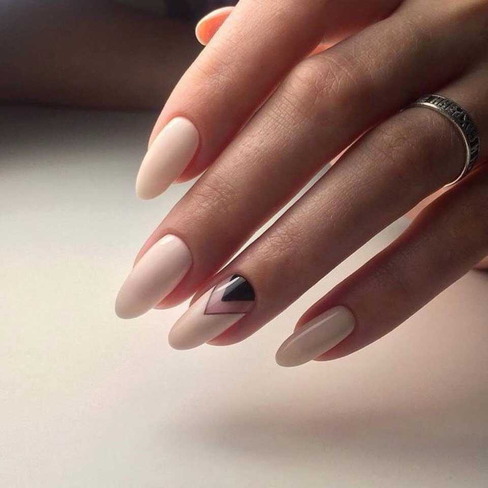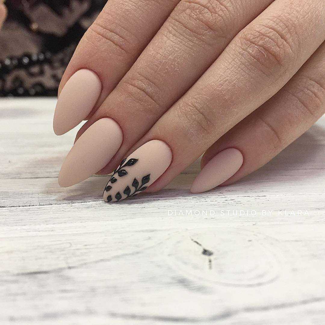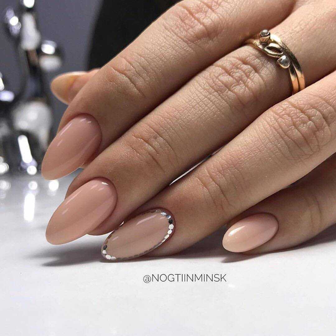 Длинные ногти дают большее пространство для фантазии и оформления ногтя. Но стоит помнить, что в тренде аккуратные ноготки практичной длины, а наращивание «по максимуму» давно не актуальны. Также на длинных ногтях стилисты не рекомендуют делать острую форму и квадрат. Для длины ногтя от 3 мм запросто можно использовать и глянцевое, и матовое бежевое покрытие. Ограничений по дизайну и декору нет.