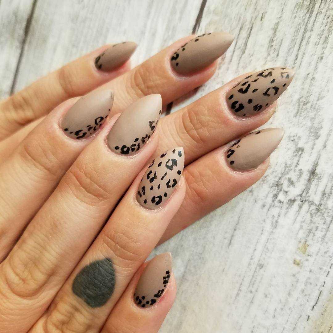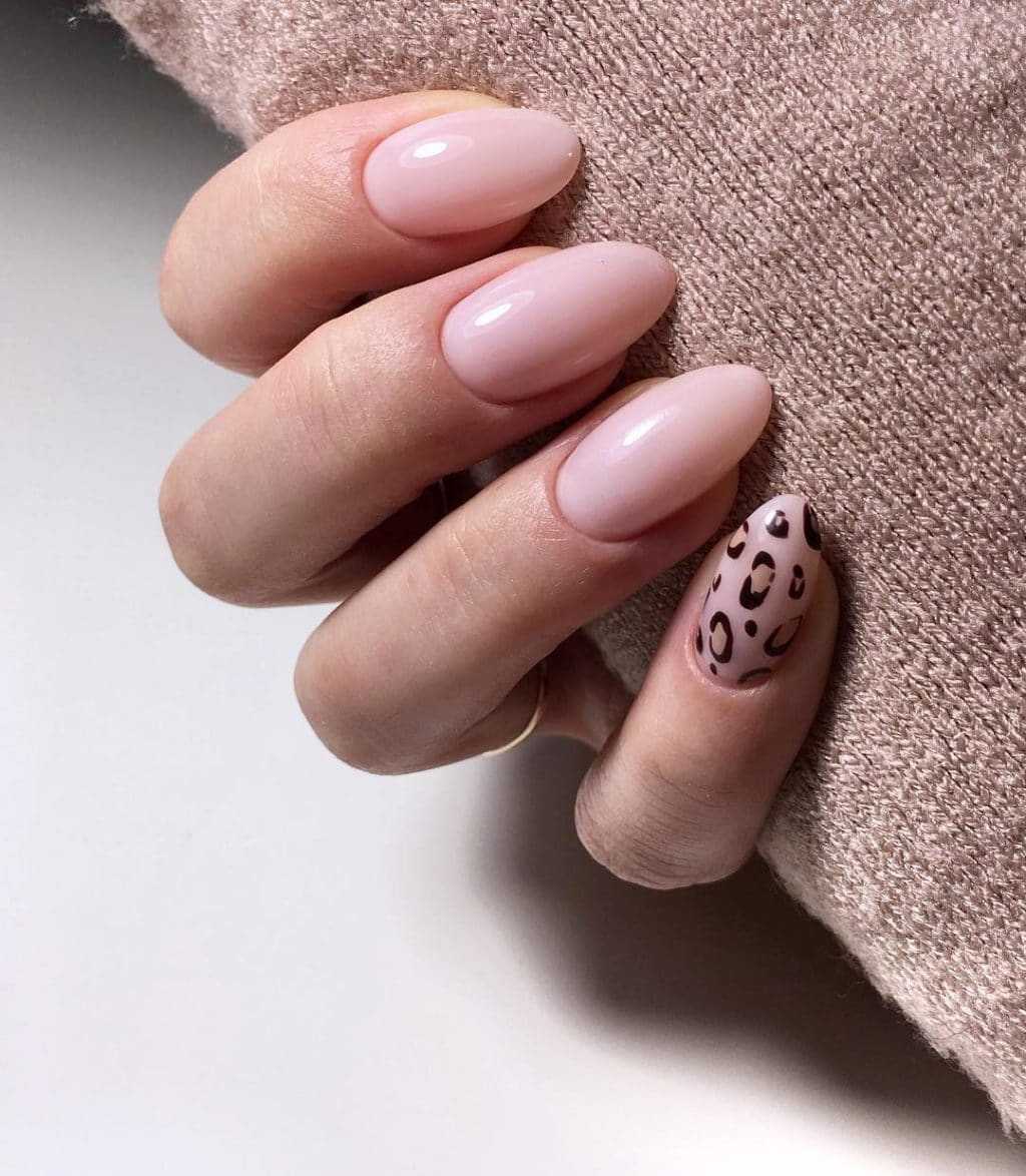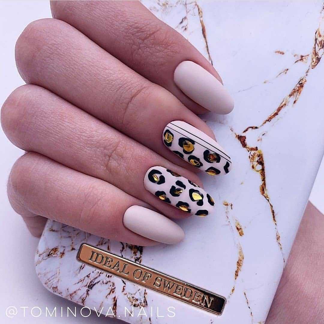 Хищный принт особенно удачно получается в бежевом цвете. Оттенок смягчает вызывающий узор, делает маникюр благороднее. В качестве дополнения используйте различные оттенки коричневого: медный, светло-коричневый, охра и другие. Интересно смотрится маникюр с геометрическим декором, который заполнен хищным принтом. Примеры такого нейл-арта вы можете видеть на фото ниже.