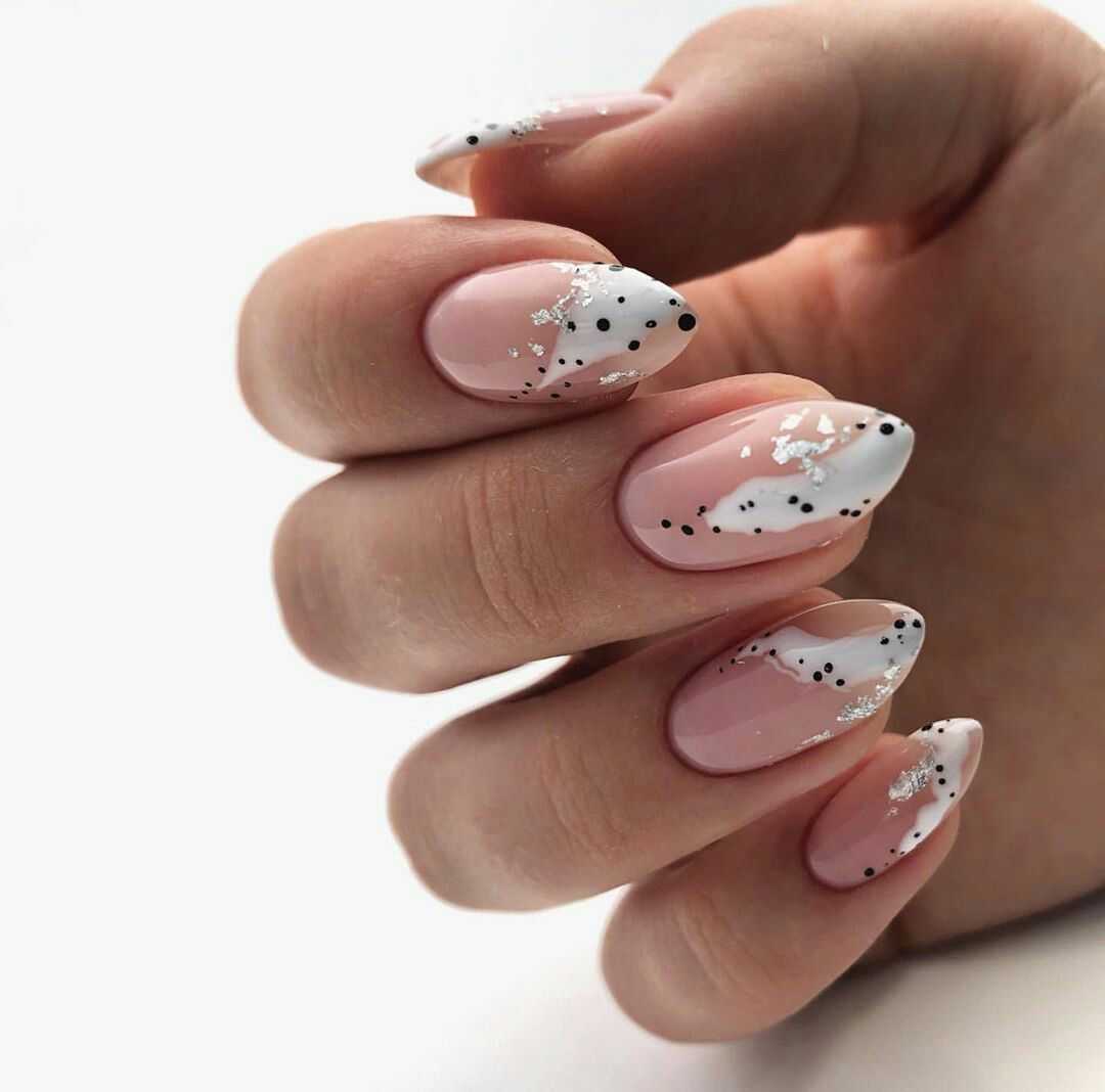 Несмотря на кажущуюся простоту, «брызги» черного цвета по светлому фону (нюд, пастельные тона любого цвета), получившие название «перепелиное яйцо», смотрятся очень интересно и необычно. Как правило, эта техника применяется на всех ноготках. Иногда можно видеть своеобразный «негатив», когда по черному наносят белые пятна.