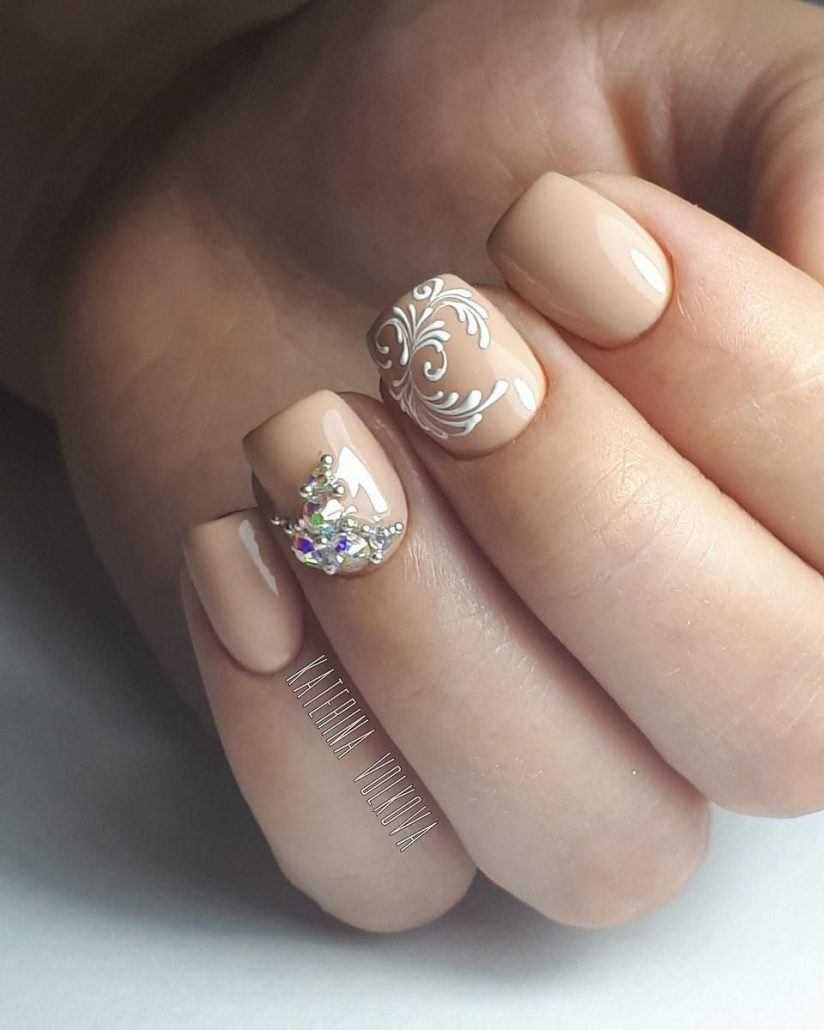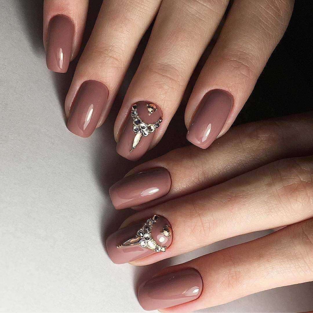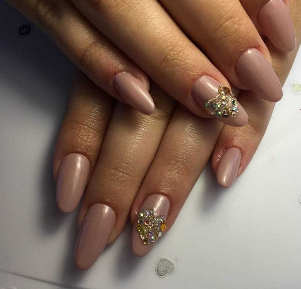 Роскошно выглядят ногти, украшенные стразами. Для повседневного маникюра уместно не перегружать покрытие пальчиков декоративными украшениями, добавлять их лишь для акцента, для праздничной атмосферы блеска много не бывает (высказывание условно, границу меры не переходить, бежевая часть должна быть видна).
