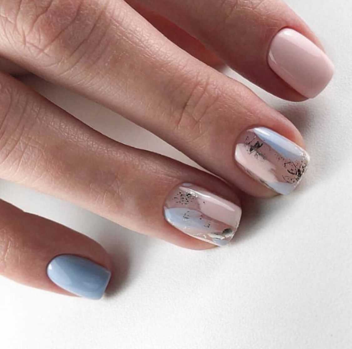 Сочетание бежевого и голубого великолепно смотрится в матовой текстуре. Такое покрытие делает дизайн еще нежнее и благороднее. Используйте фольгированные полосы или серебряный глиттер, чтобы разнообразить нежный бежево-голубой нейл-арт.
