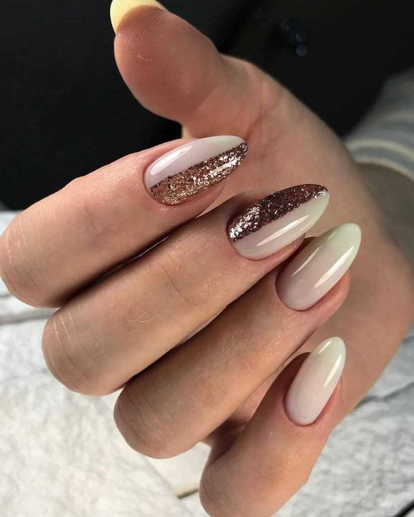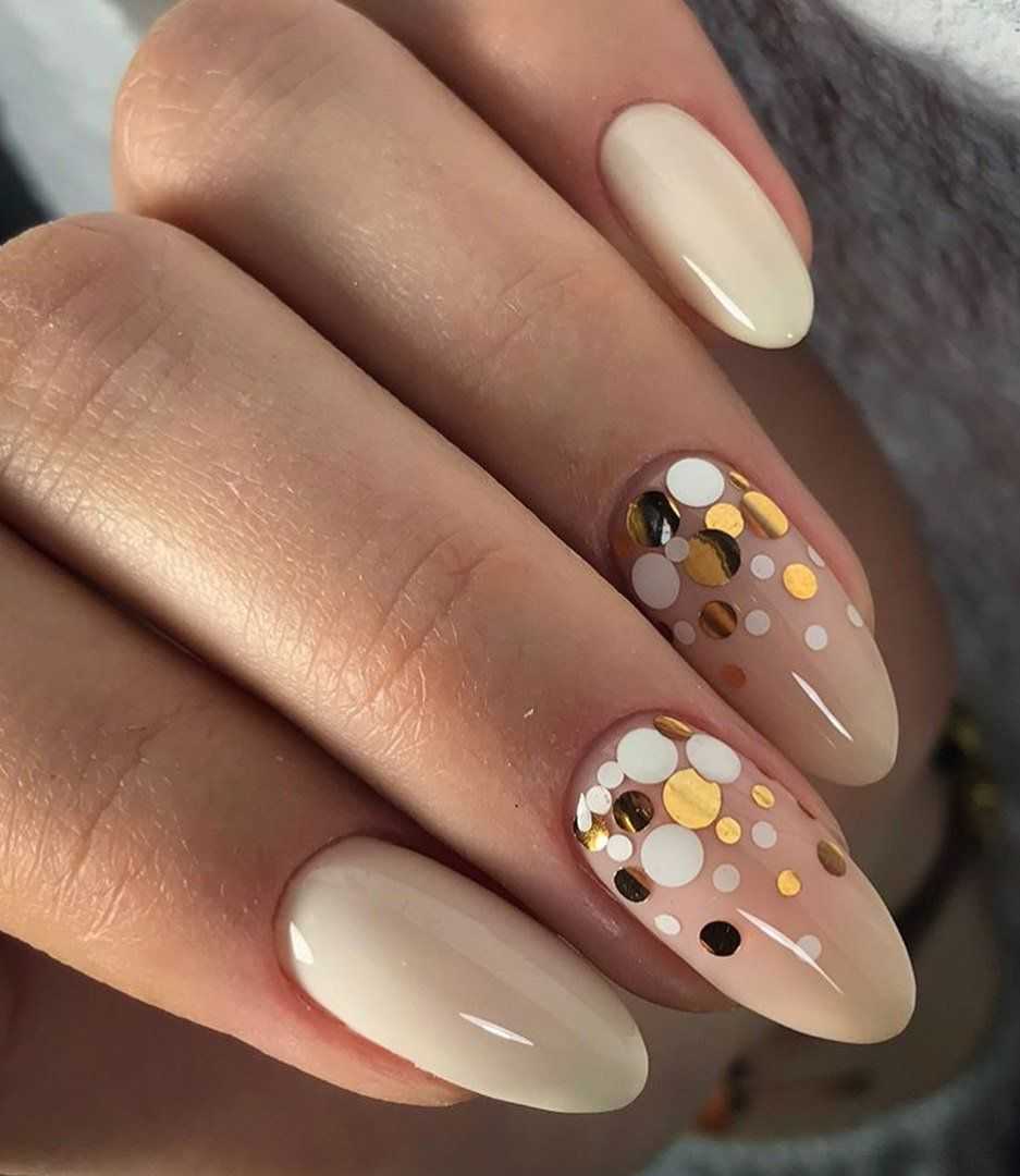 - Поочередно покрыть ногти на разных пальцах бежевым и золотым цветом. Для получения оригинального дизайна можно использовать золотые блески, нарисовать узор, имитирующий золотое литье, использовать конфетти золотого оттенка.
