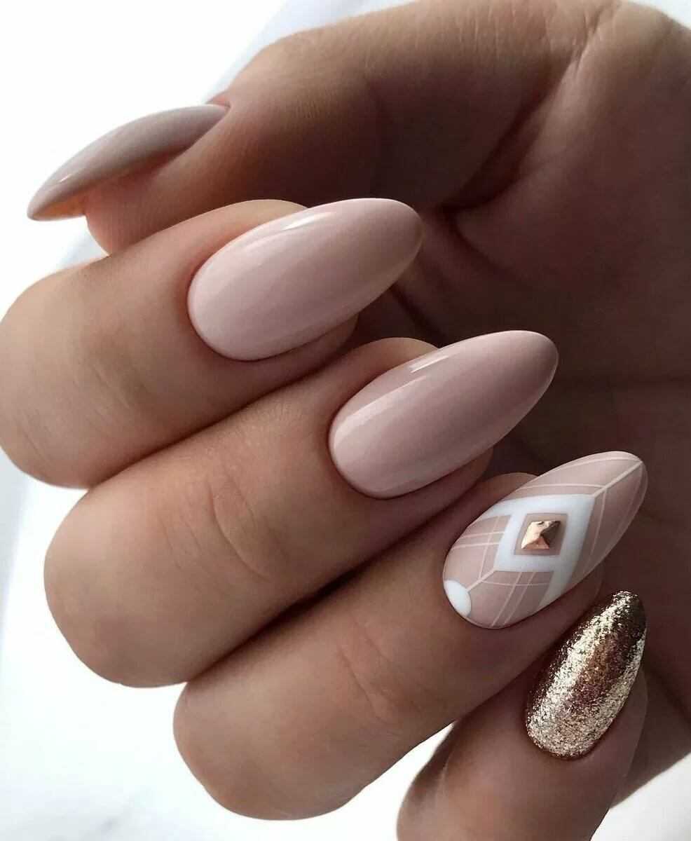Модный миндалевидный маникюр с бежевых тонах Современный дизайн ногтей с бежевым гель-лаком и геометрическими рисунками