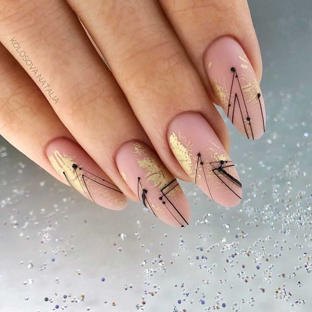 - бежевый маникюр с золотом и черным – одно из самых эффектных решений. Два ярких цвета наносятся на мягкий сдержанный фон и смотрятся поистине непревзойденно;
