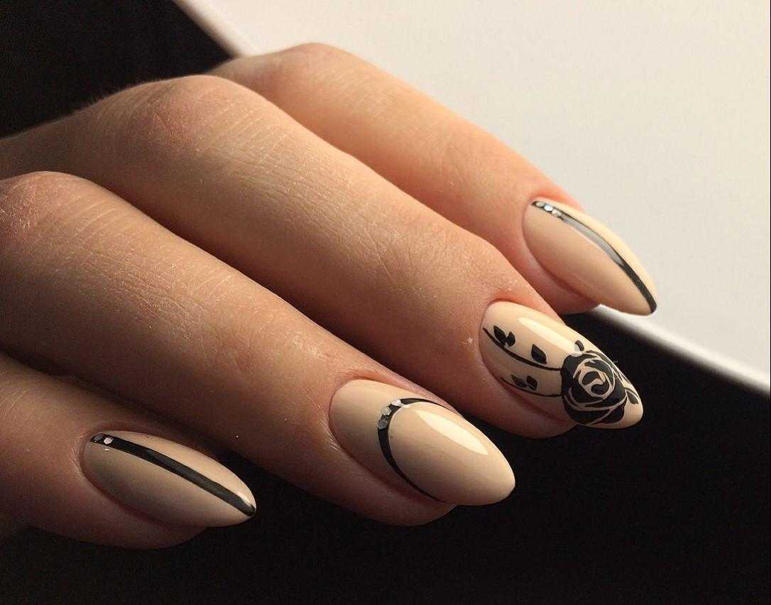 Отдельно стоит обсудить самое главное преимущество бежевого маникюра с черным рисунком – его универсальность. Подобное сочетание идеально подходит к любому наряду и образу: не будет отвлекать в рабочие моменты и в тоже время не создаст диссонанс с праздничным платьем. Фото бежевого маникюра с рисунком черного цвета, как нельзя лучше доказывает универсальность подобного колористического сочетания.