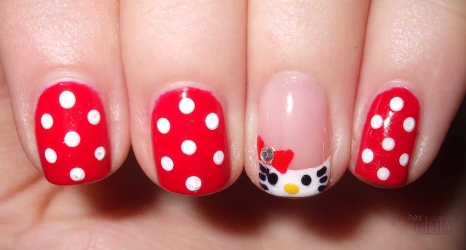 - Маникюр в стиле Микки Мауса. На ногти наносятся мордочки популярных героев, на другие всеми известные ушки, на следующие бантик Минни. Получается очень ярко и сразу можно узнать из какого мультика.