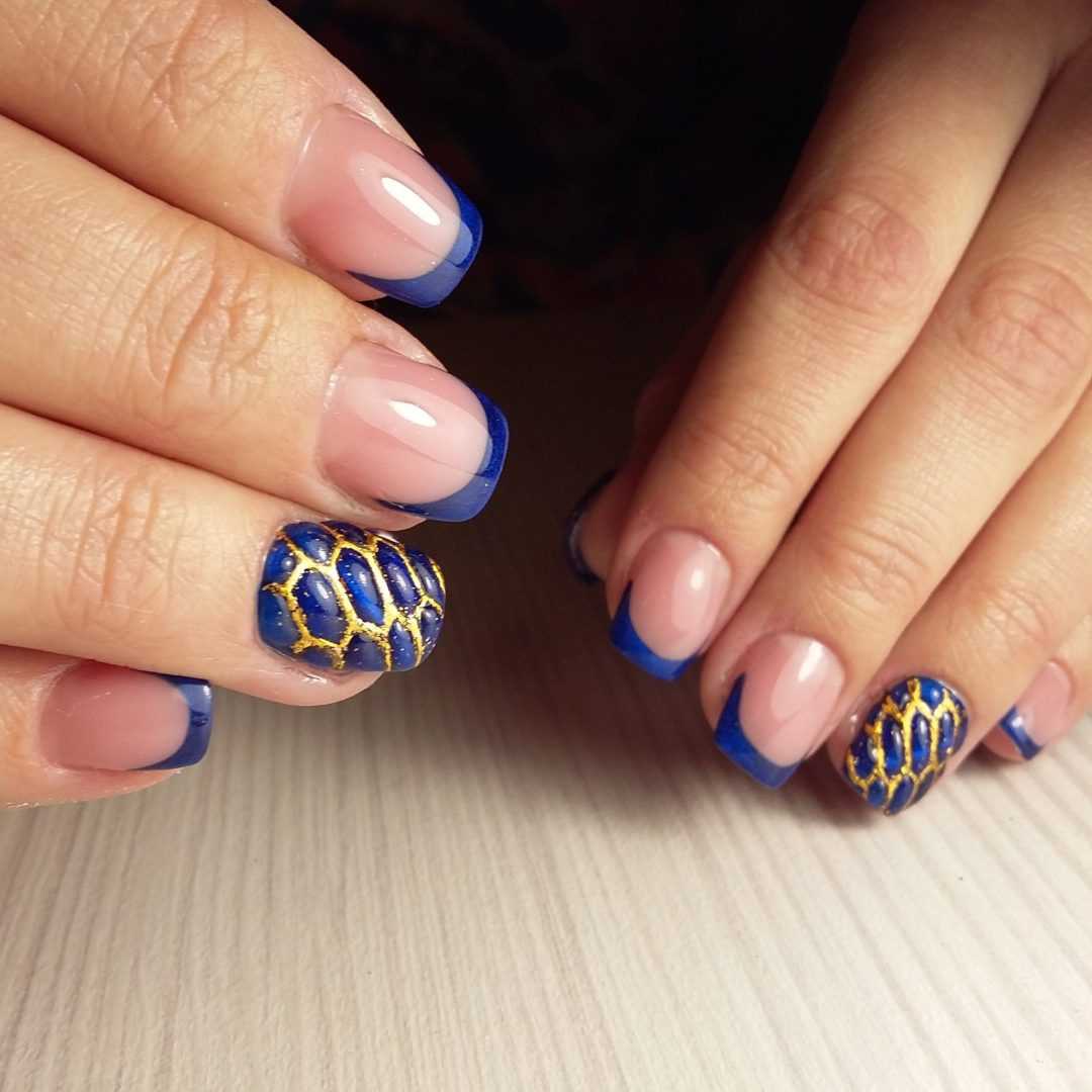 - на коротких квадратны ногтях отлично будет смотреться вариант синего французского маникюра с элементами золотой фольги;