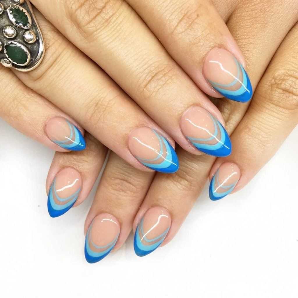 - острые геометрические концы, о которых уже говорилось в начале. Оригинально выглядит, когда одна сторона улыбки голубая, золотистая или белая, а вторая синяя. Такой французский маникюр будет в тренде ещё не один сезон.