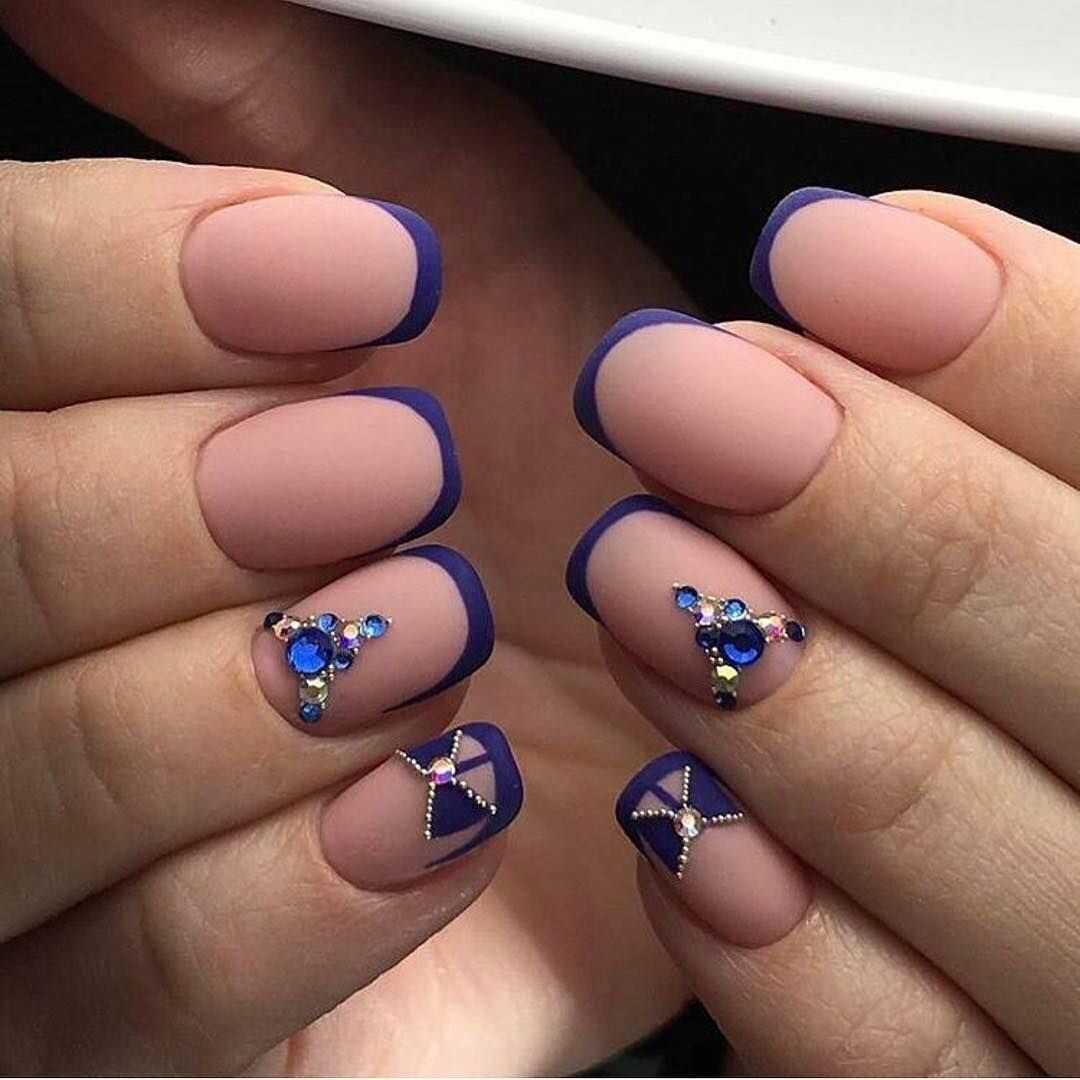 - матовый бежевый, как основа французского маникюра, станет отличным вариантом для всех модниц в этом сезоне. При этом край ногтя лучше обработать синим глянцевым гель-лаком;