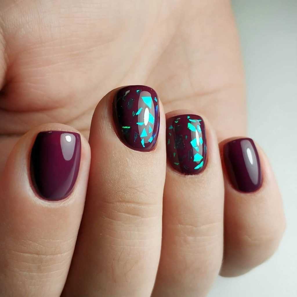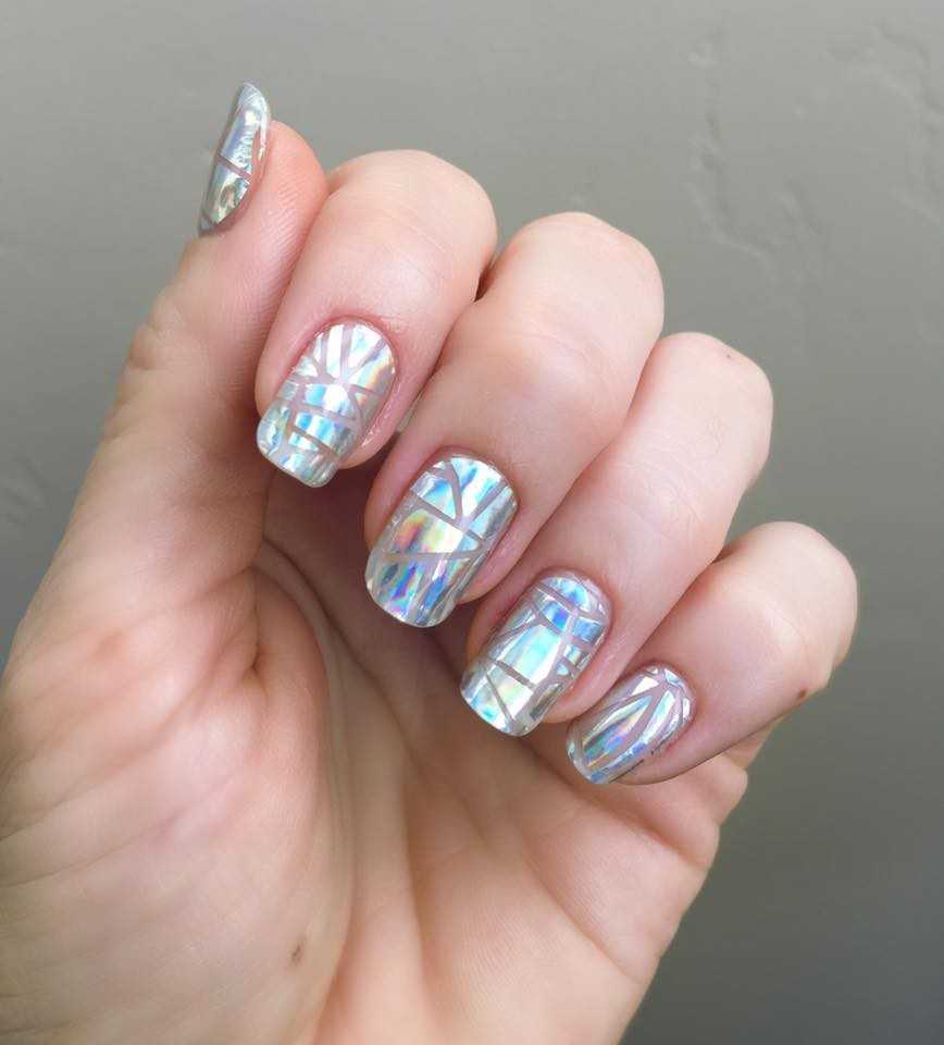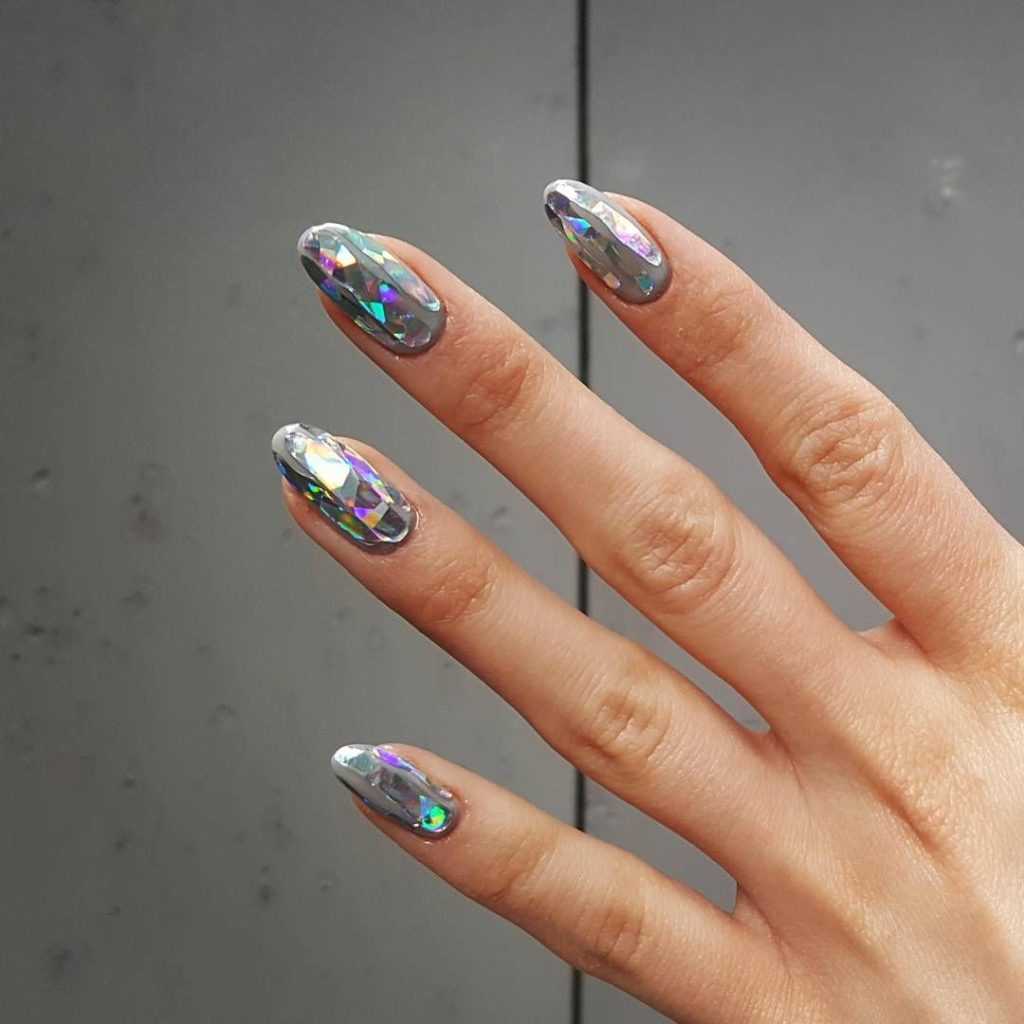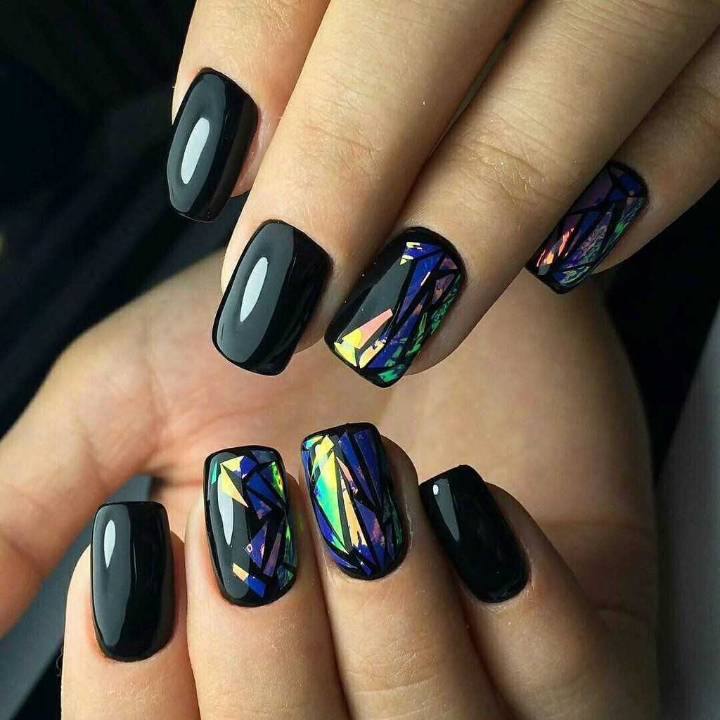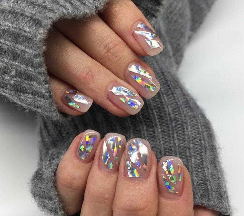 Хотите сделать маникюр, словно из сказки о Снежной королеве? Выбирайте дизайн «битое стекло». Это необычный вариант, когда с помощью кусочков фольги мастер создает на пластине эффект осколков стекла или льда. Смотрится очень многогранно и загадочно.