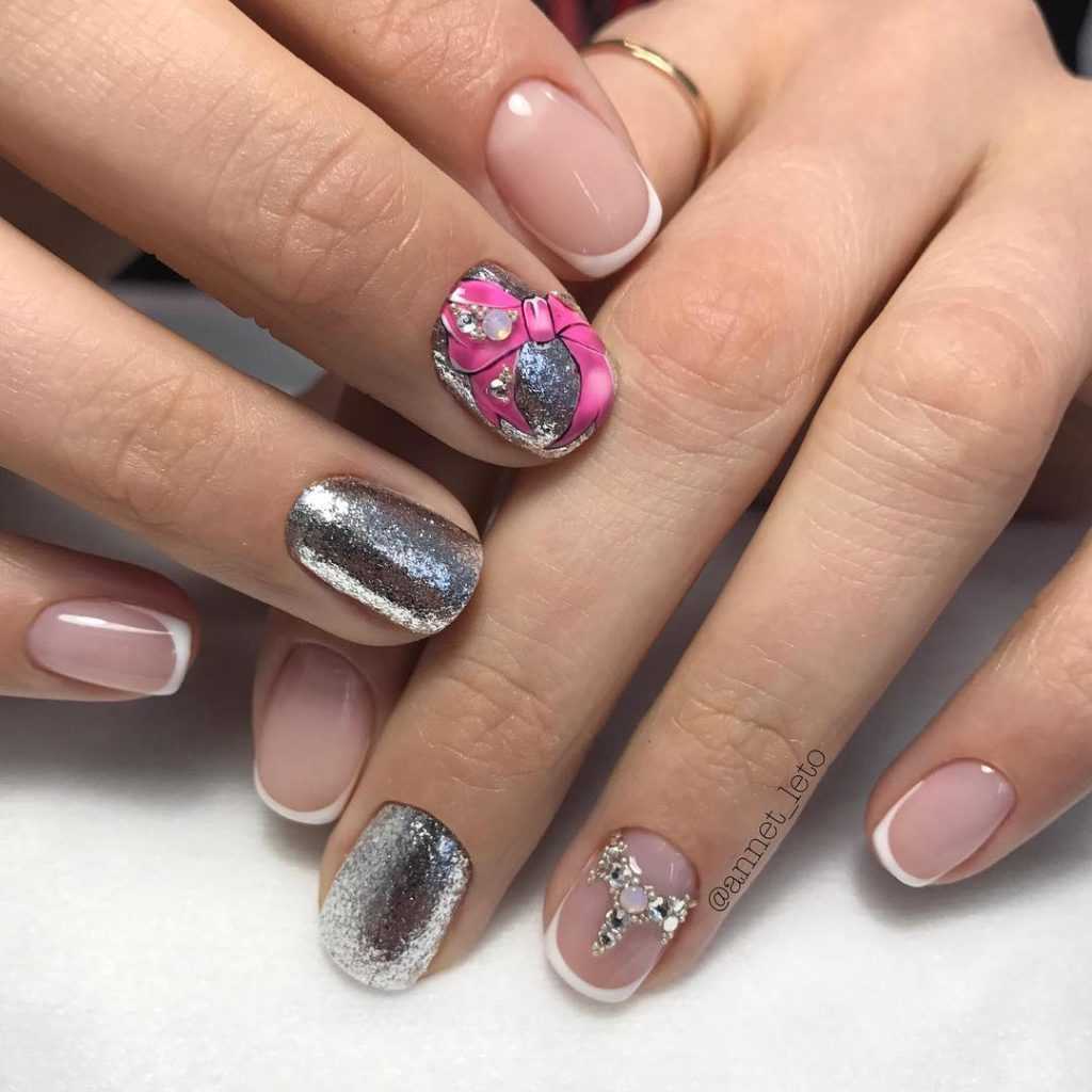 С короткими ногтями важно просто следить за тем, чтобы узор вытягивал или просто украшал пальчик, но не расширял и акцентировал внимание на его минимальной длине. Френч вдохновляет на миллион разных вариантов, это вторая улыбка серебряным цветом или выложить ее стразиками, здесь также вариантов очень много. Кстати, если уж приближать все к трендам, то лучше делать миндальный французский маникюр