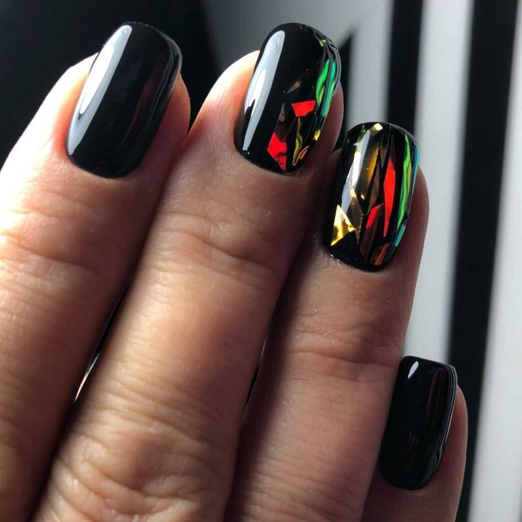 Для создания черного элегантного образа в новый год, в качестве дополнения к образу стоит сделать черный маникюр с блестками. Они делают дизайн интересным и праздничным. Черный фон используется для разных техник нейл-арта, к примеру для покрытия лаком кошачий глаз, чтобы цвет не плешивел и выглядел насыщенно.