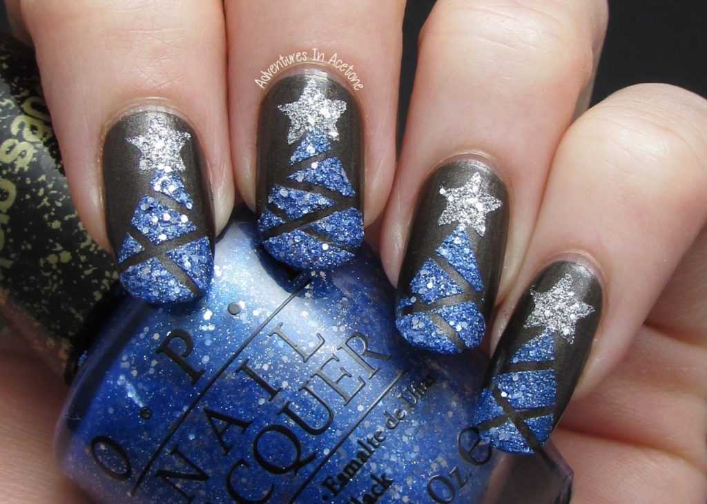 С ним в новогодний вечер все внимание окружающих будет сосредоточено на ваших ручках. Для эффектности и легкого декорирования можно не использовать рисунки, а просто украсить поверхность блестками в форме звездочек
