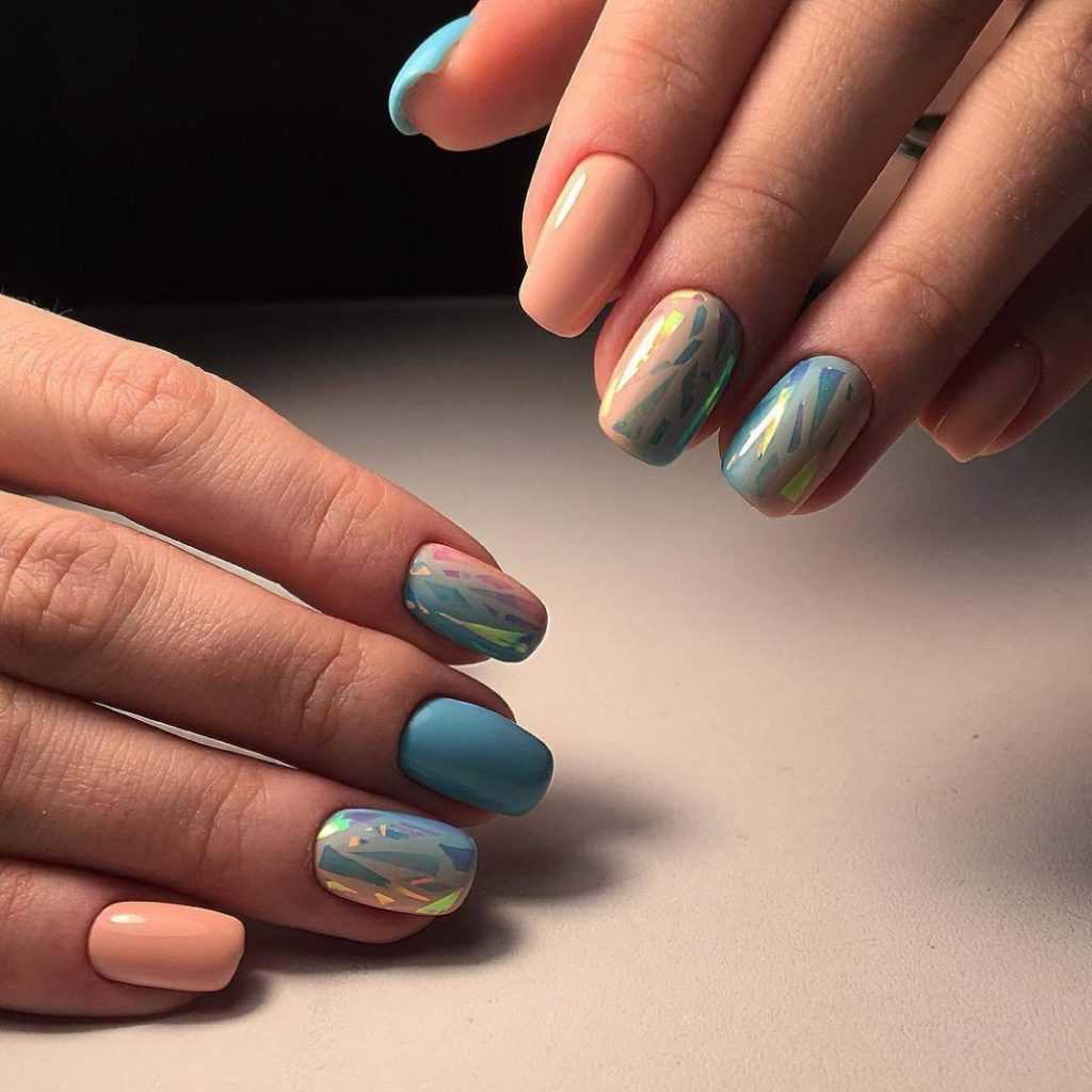Стекло. Делая акцент стеклом на паре пальцев, девушка дополняет свой образ каким-то магическим шармом. Все остальные ногти покрываются любыми пастельными оттенками. Очень скромно и мило смотрится стекло на прозрачном покрытии.