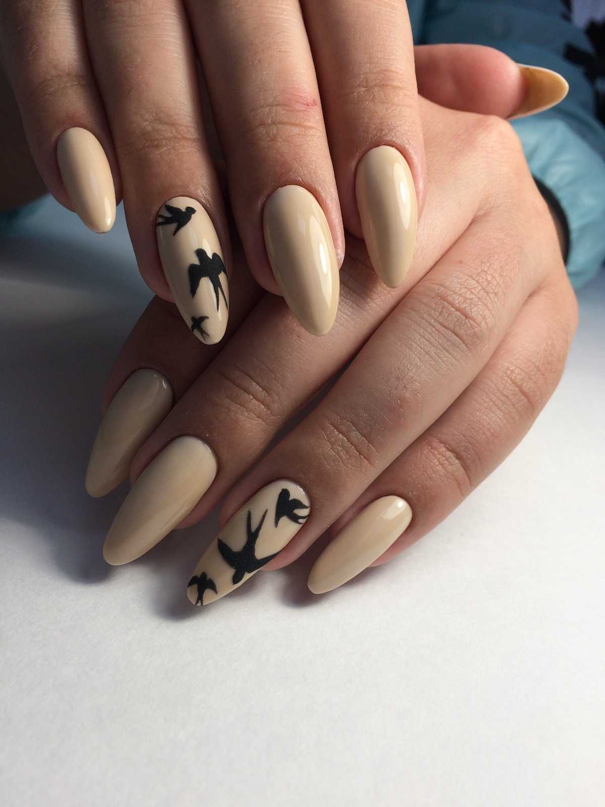 Любителям стиля минимализм предлагаем обратить внимание на украшение ногтей нежными веточками, листьями, животными, птицами. Дизайн лучше всего выполнять черным гель-лаком на светло-коричневом фоне