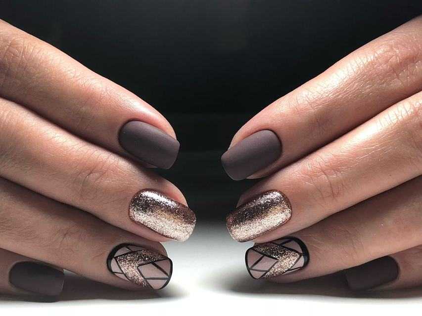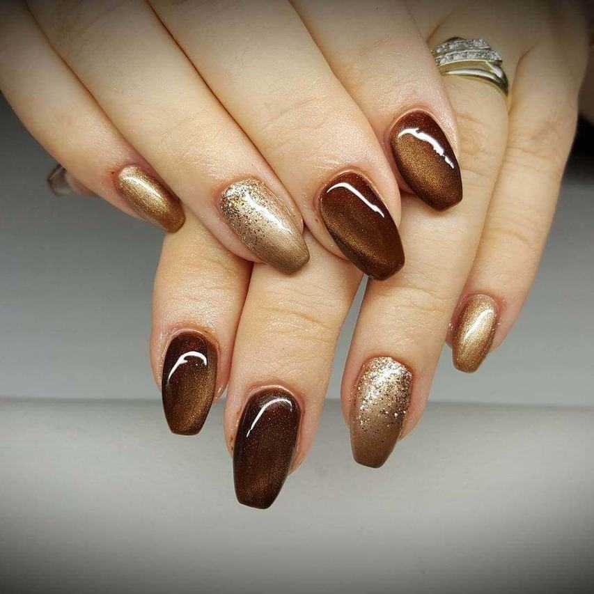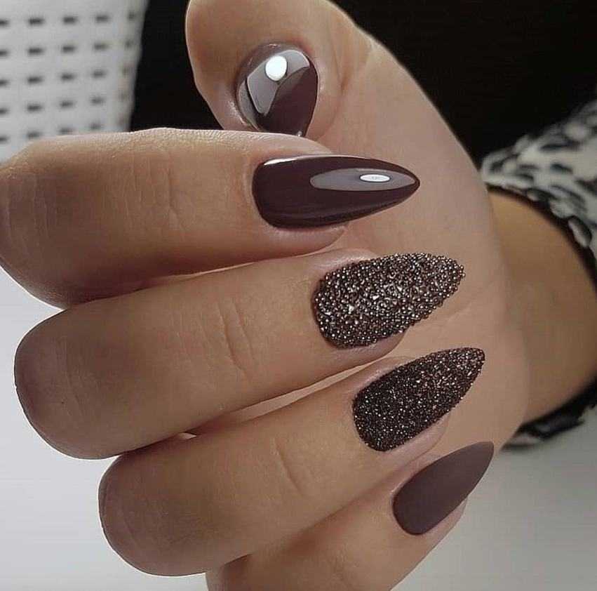 Сделать маникюр праздничным можно с помощью блесток. Золото на фоне шоколада смотрится шикарно, матовую или глянцевую поверхность украсит покрытие блестящими затейливыми узорами.