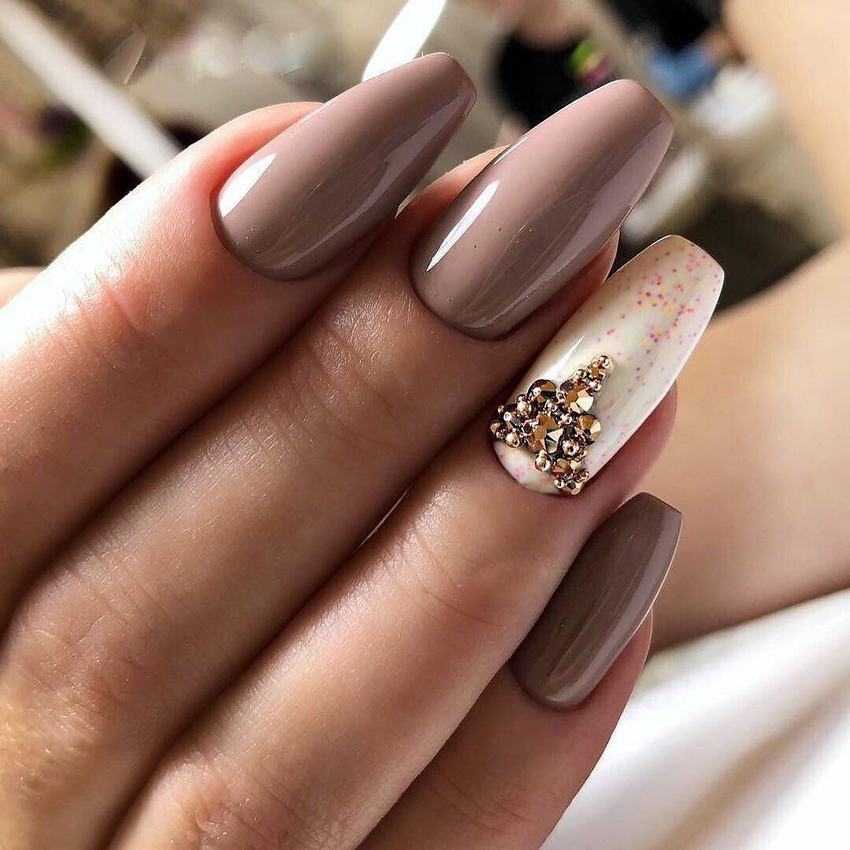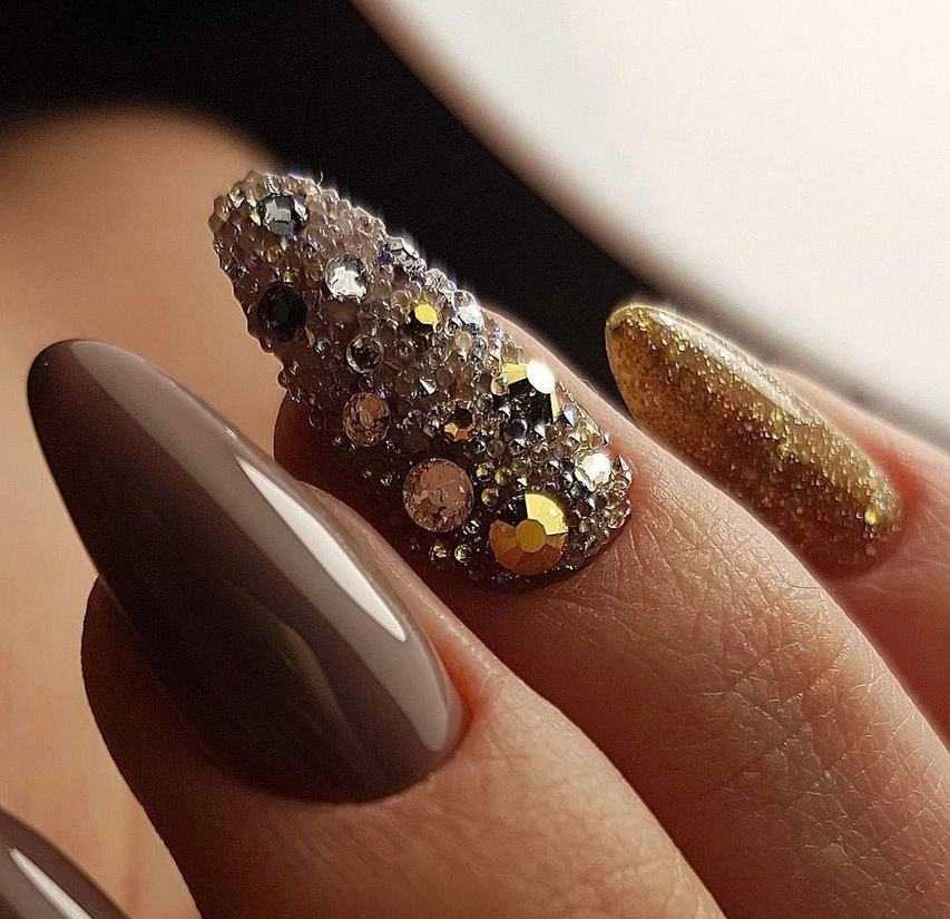 В коричневом маникюре можно задействовать золотистые и серебристые блестки, стразы размещают там, где требуется.