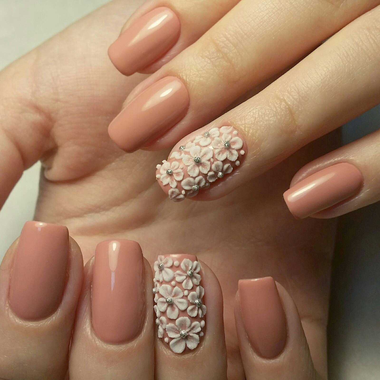 - маникюр с флористикой на бежевом фоне
