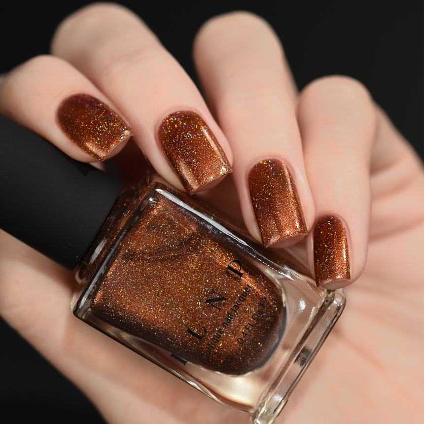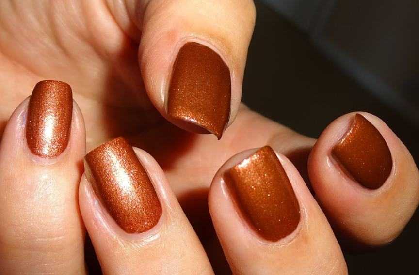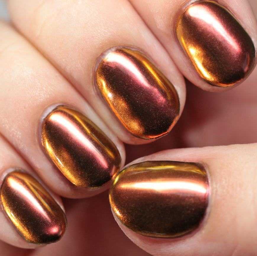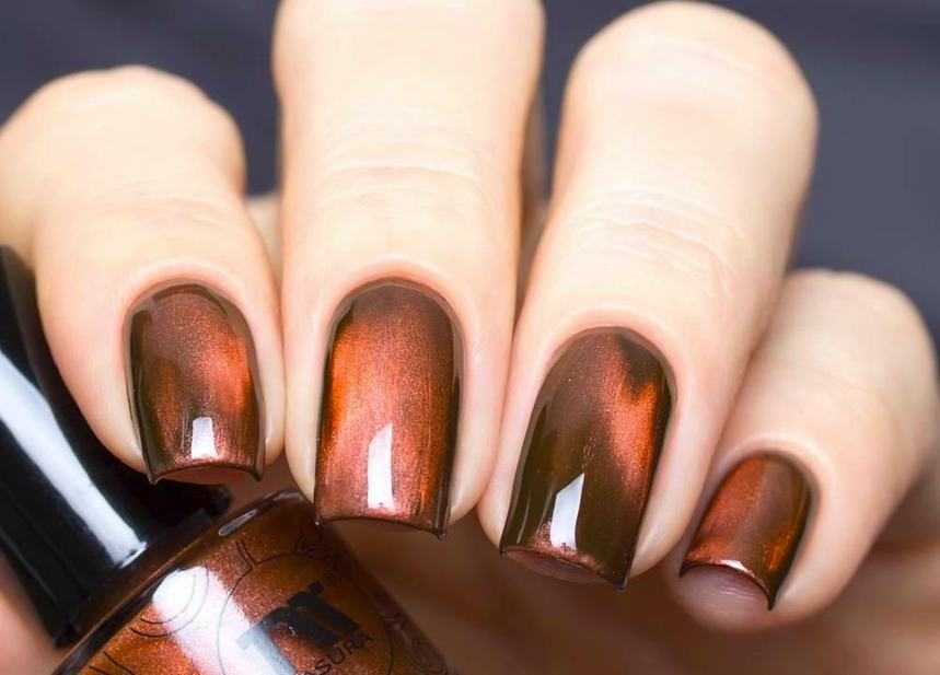 Медный относят к категории ярких оттенков, поэтому он делает оформление ногтей броским. Если задействовать лак с эффектом металлик, ногтевые пластины будут выглядеть так, словно и в самом деле покрыты медью.