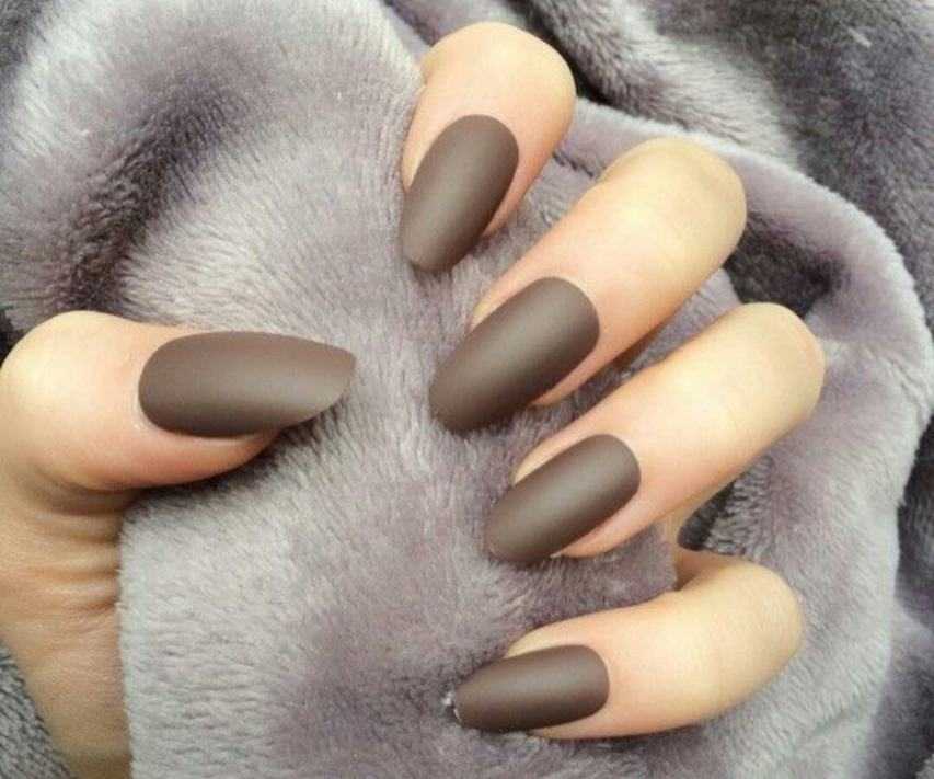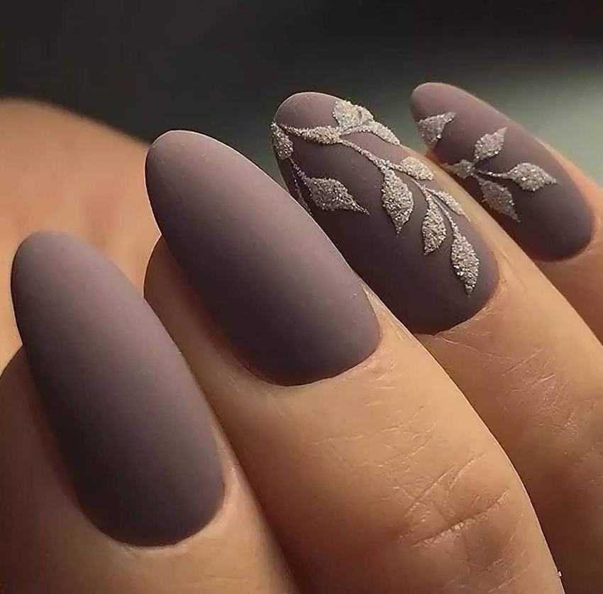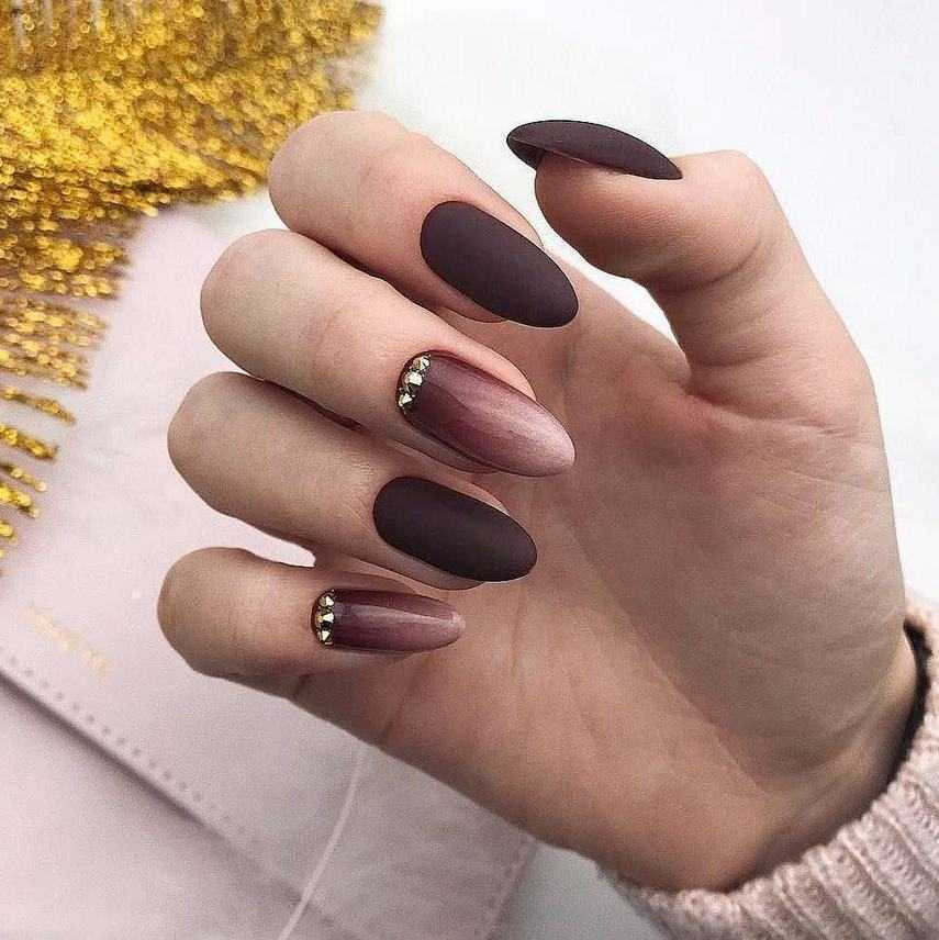Матовый лак коричневого цвета сделает нейл-арт нежным и женственным. Привлекательнее всего смотрятся светлые оттенки коричневого. Матовое покрытие отлично гармонирует с декором в виде страз.