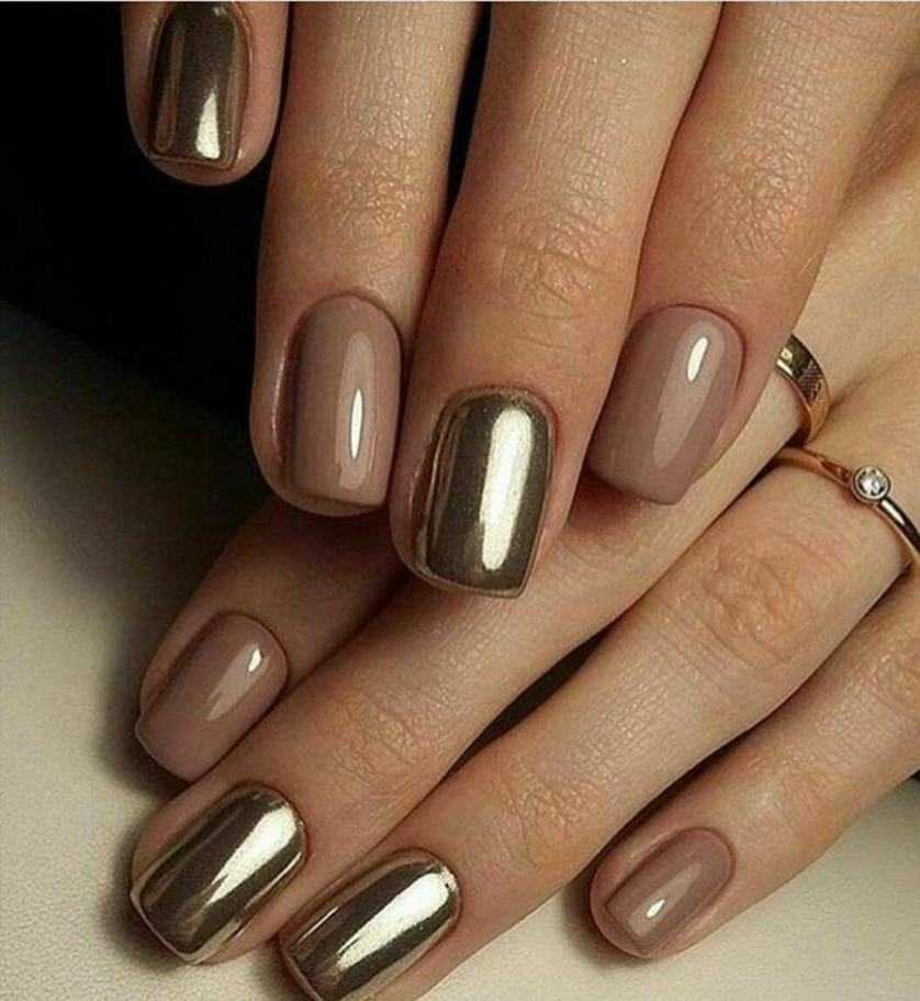 Для нарядного варианта хорошим решением также станут блестки золотого и серебристого цветов. Ними можно покрыть ноготки лишь частично, как описано выше, а можно нанести такие блестки полностью, но только на некоторые пальчики.