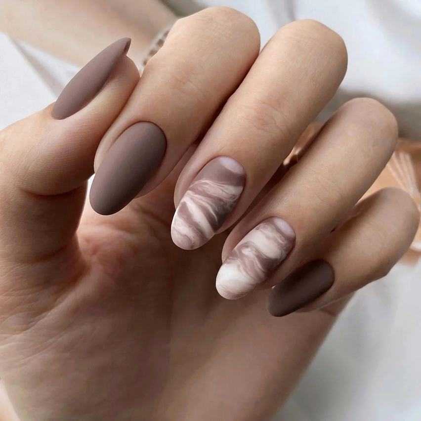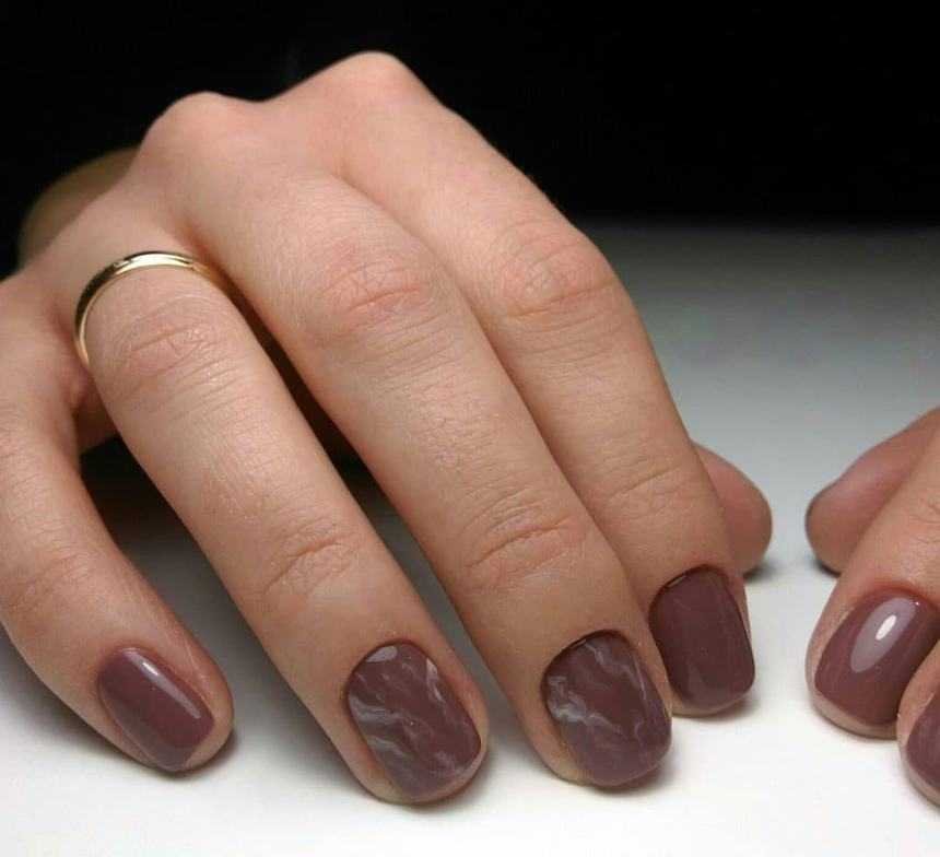 Такой подход к выполнению маникюра придает ему реалистичный и законченный вид. Шоколадный мрамор на ногтевых пластинах рекомендуется располагать выборочно, не декорировать так каждый палец.
