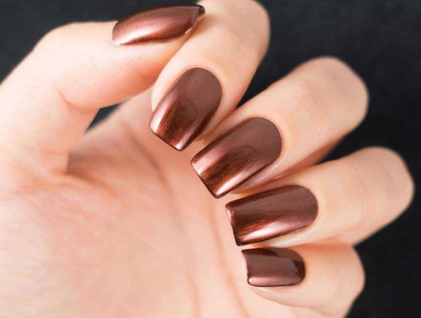 Лаки коричневых оттенков подходят для создания маникюра любого стиля. Так, бежевый или песочный подойдет для строго лунного или французского маникюра, а шоколадный, кофейный или медный для праздничного. Плюс коричневого цвета в том, что он сам по себе выглядит изысканно и легко сочетается с другими оттенками и яркими декоративными элементами.
