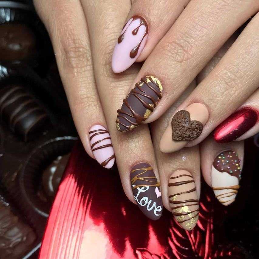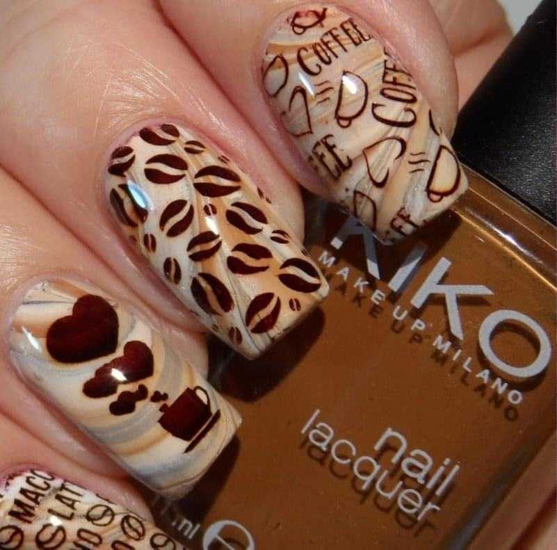 Дизайн должен соответствовать колористической гамме. Изобразите на ноготках зерна кофе, чашечку с кофе, надписи, кусочки шоколада и другие узоры, которые у вас ассоциируются с коричневым цветом. Чтобы избавиться от плоскости коричневого маникюра, разбавьте его бежевым или белым цветом.