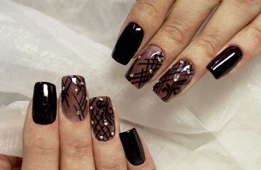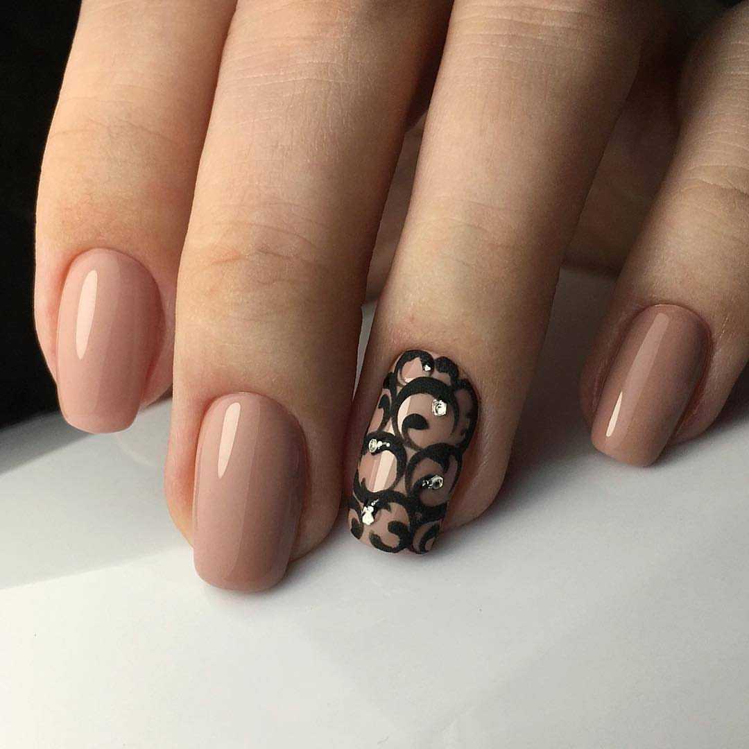Далеко не всегда такой вариант маникюра выглядит мрачно. Нежно и изысканно смотрится дизайн, в котором черным цветом выполнены только рисунки. Это может быть растительный орнамент, кружево. Это прекрасный вариант для того, чтобы выглядеть строго, современно и стильно в любой ситуации.