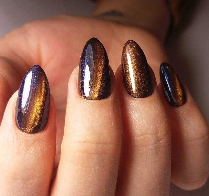 Мягкие переливы в шоколадных тонах позволит создать покрытие с эффектом «кошачий глаз». При выборе магнитного варианта модницы получают еще и оригинальный дизайн.