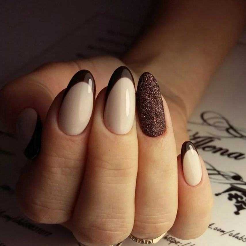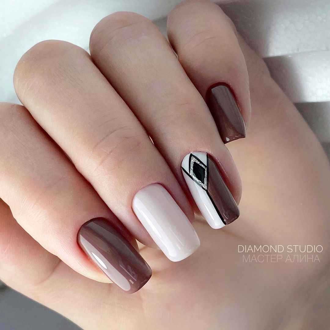 Сочетание коричневого и белого является самым популярным в дизайне ногтей. В этом маникюре коричневый цвет является отличной альтернативой категоричному и не всегда уместному черному. Бело-коричневый маникюр выглядит очень нежно и мягко. Ногтевой арт можно делать как на коротких, так и на длинных ногтях.