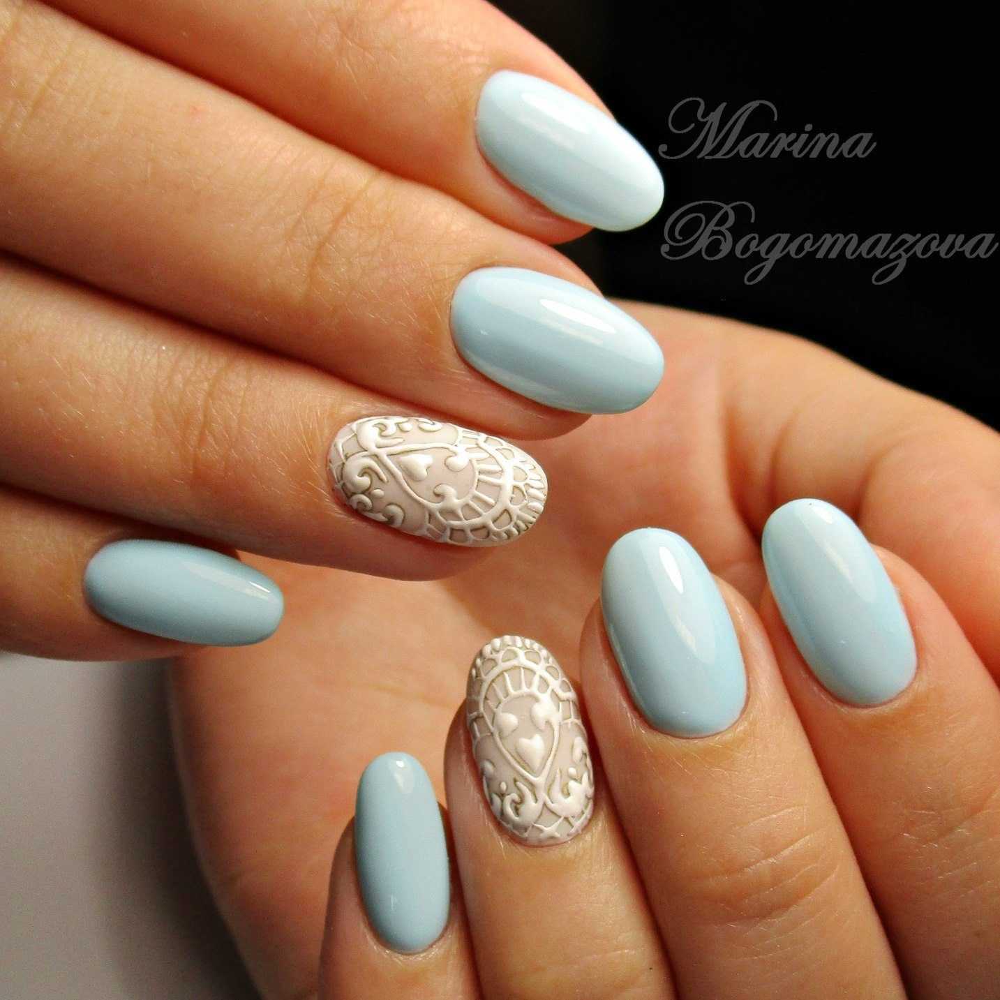Еще одно нежное и женственное сочетание – это бежевый и голубой. Такой тандем отлично смотрится в молодежных весенних и летних образах. В тренде однотонное окрашивание ногтей в голубой и бежевым. Это самый простой, но при этом стильный вариант декора ноготков.