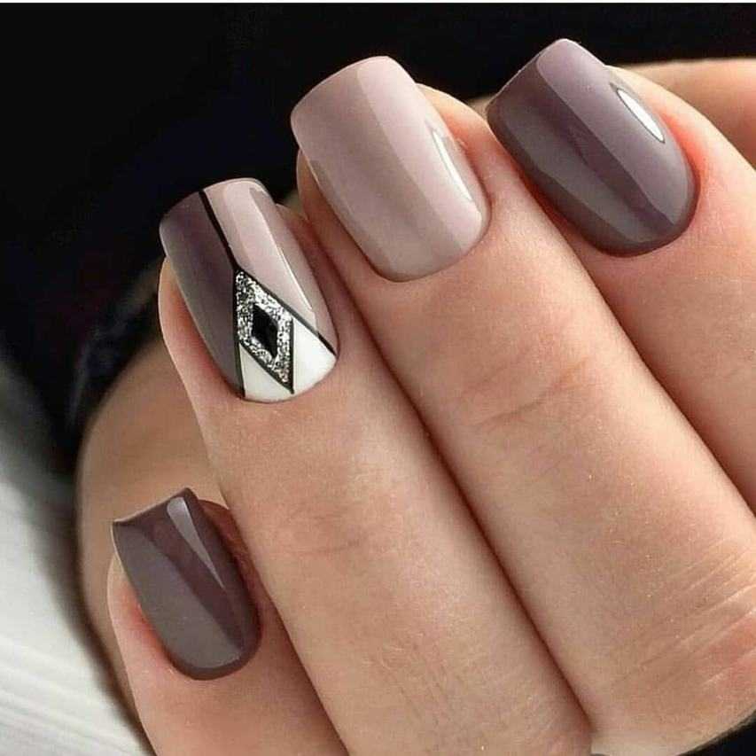 Если вы не хотите усложнять маникюр, сделайте монохромный маникюр, окрашивая ногти попеременно в коричневый и белый цвета. Элегантный монохромный нейл-арт со стразами или посыпкой на короне.