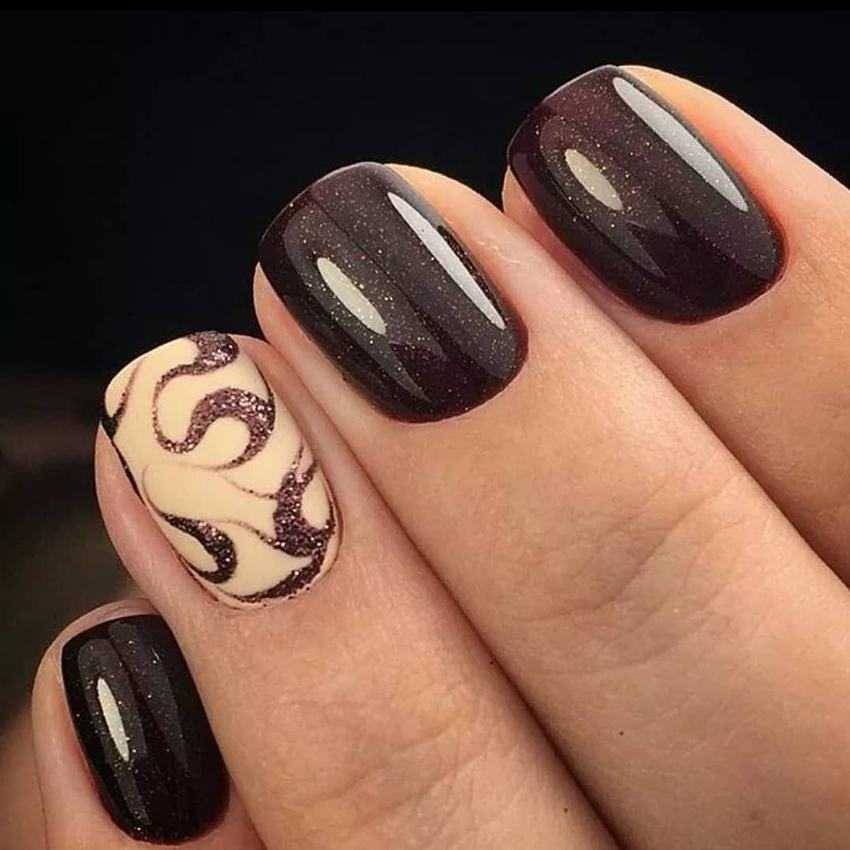 Черный и коричневый цвета на одном ногте выглядят очень благородно и сдержанно. Этот маникюр подчеркивает тонкую натуру обладательницы, которая уверена в своих решениях. Ведь не каждая девушка решится на маникюр в таких выразительных и заметных оттенках.