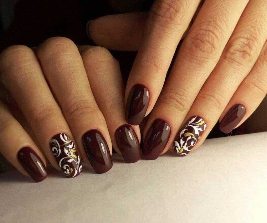 Это одна из самых красивых разновидностей нейл-арта. Коричневый колер выглядит насыщенно. Такой маникюр отлично впишется в праздничный образ.