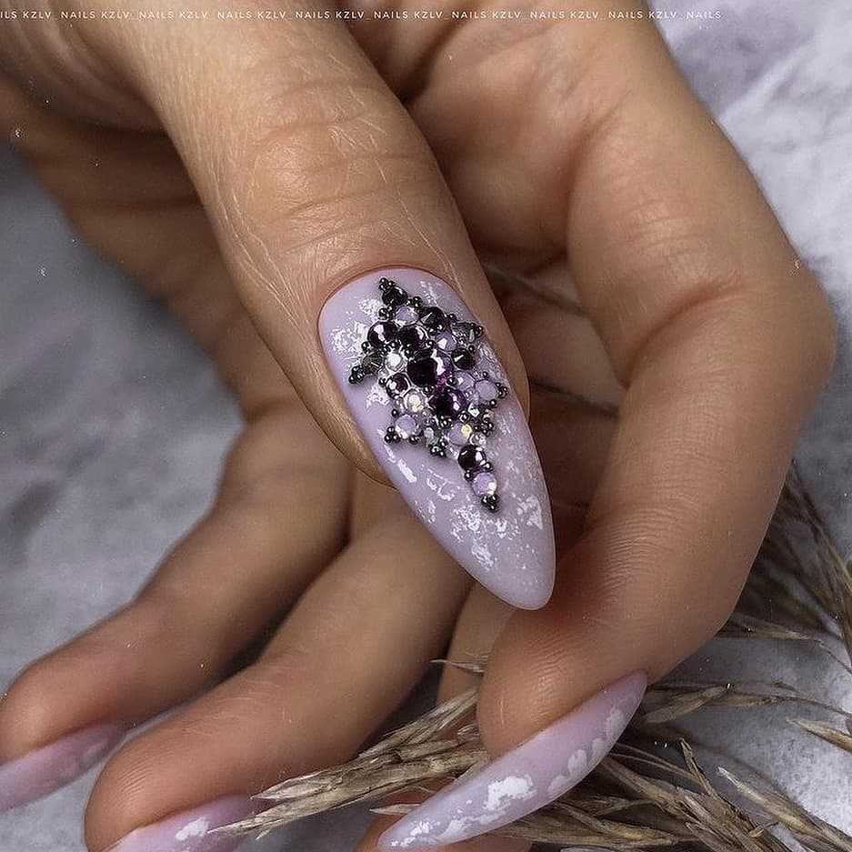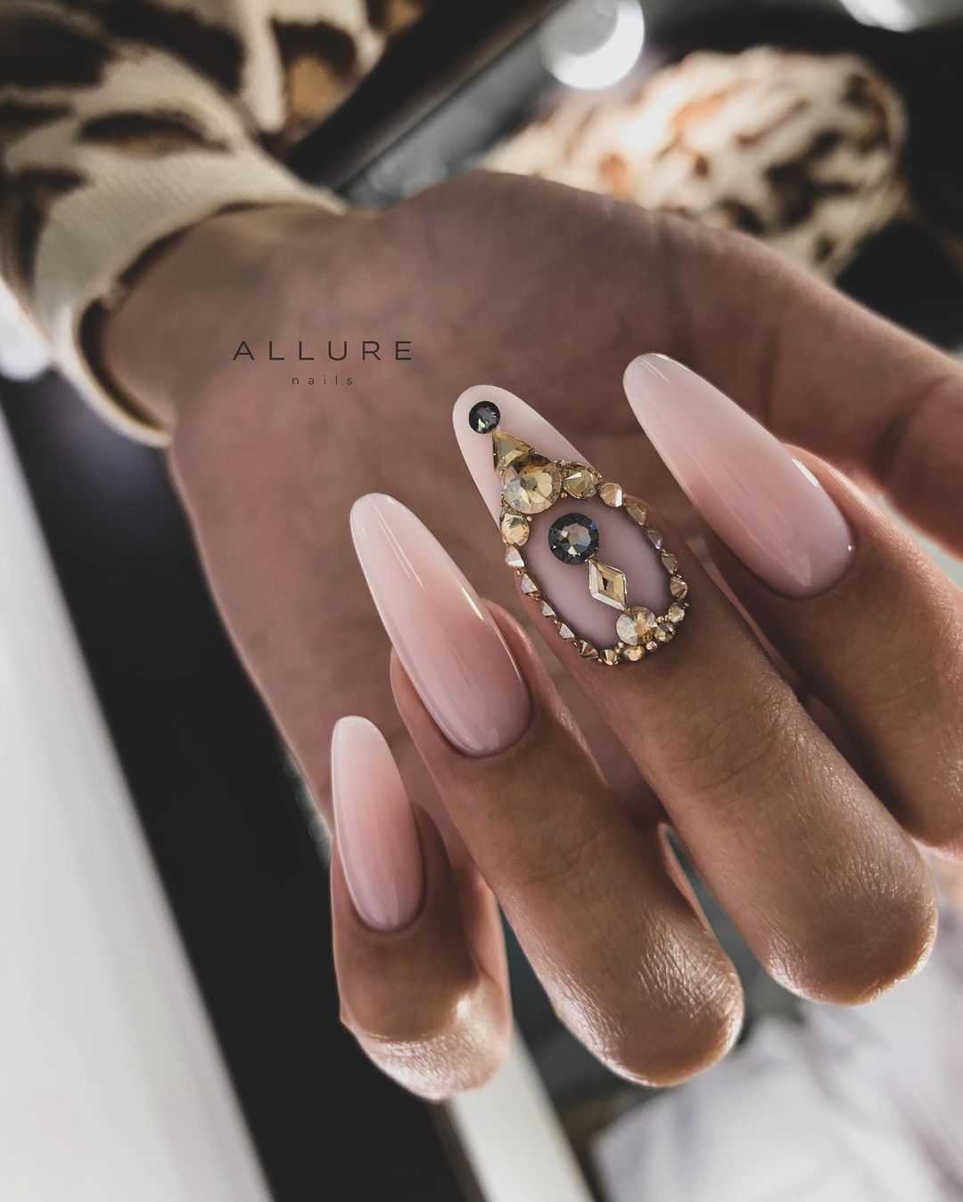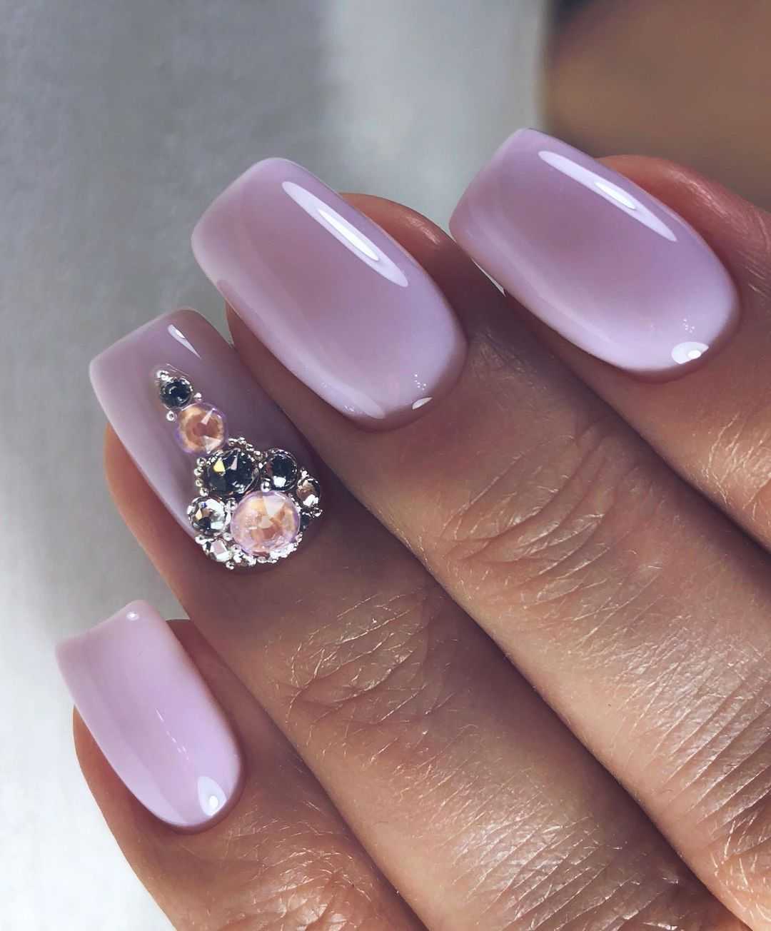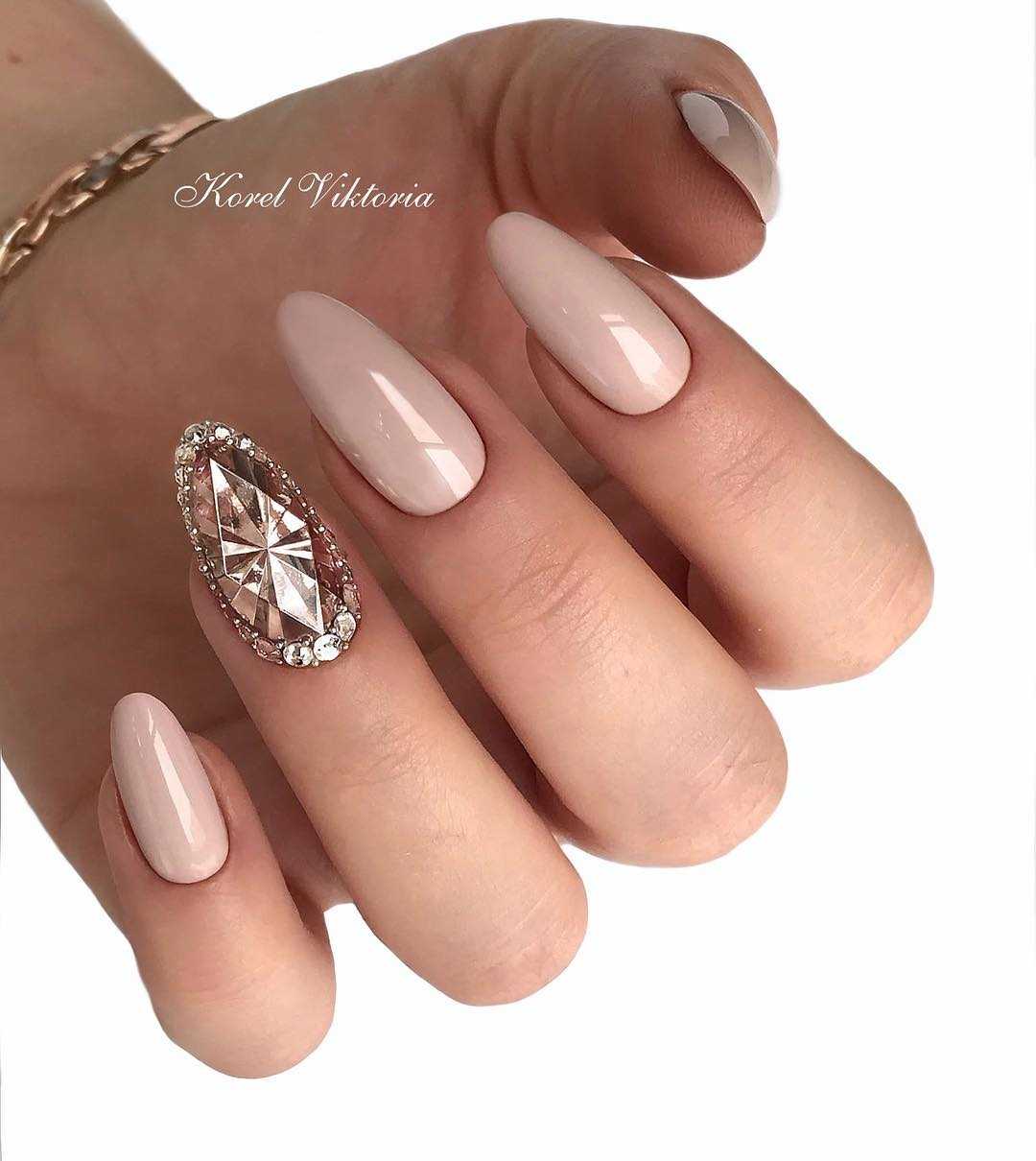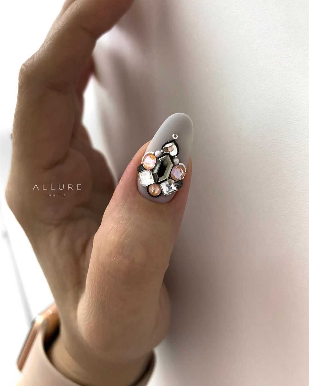 Еще один вариант создания праздничного, вечернего маникюра – стразы. Однако в этом сезоне они могут быть очень объемными. Ими украшают ногтевые пластины в зависимости от желаемого результата. Если предстоит вечеринка или праздник, ноготь можно полностью усыпать камушками, если нужно добиться более сдержанного, повседневного результата, достаточно одного камушка. Отличная основа для страз – пастельные оттенки – персиковый, розовый, молочный, песочный, бежевый.
