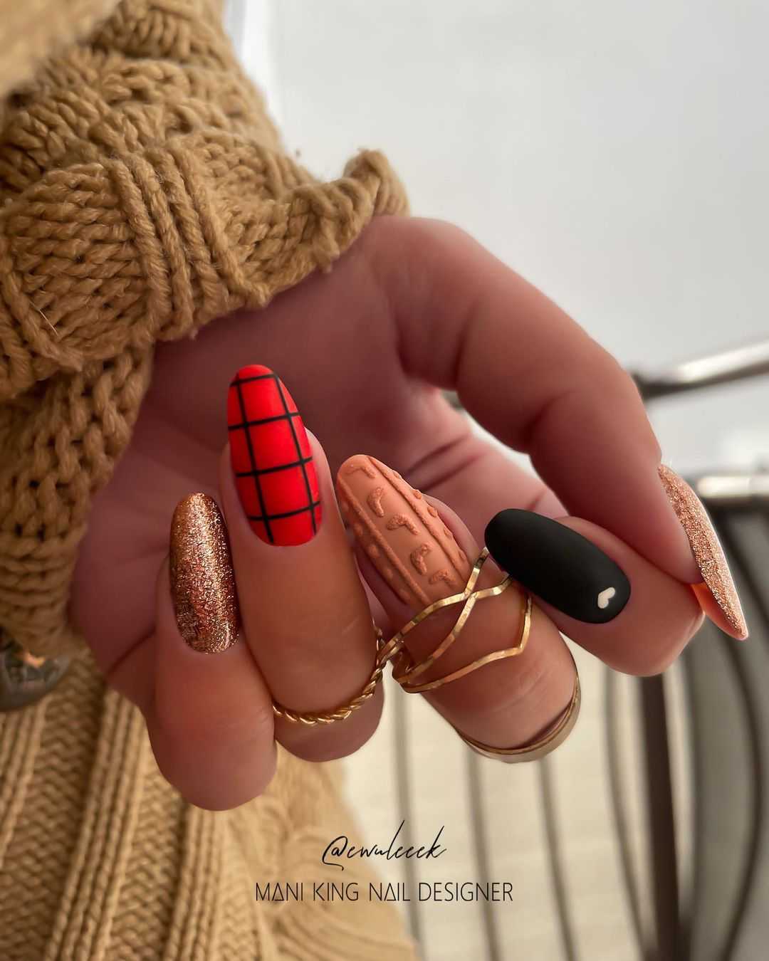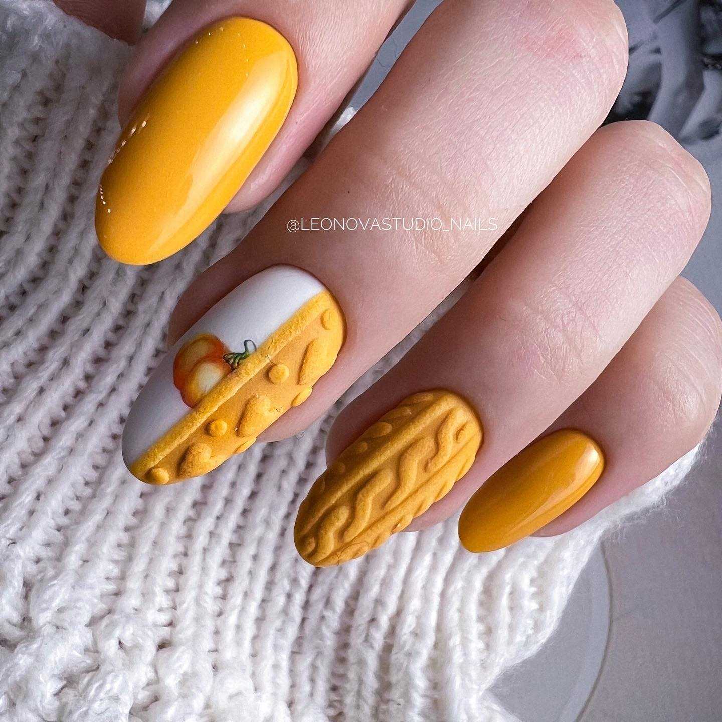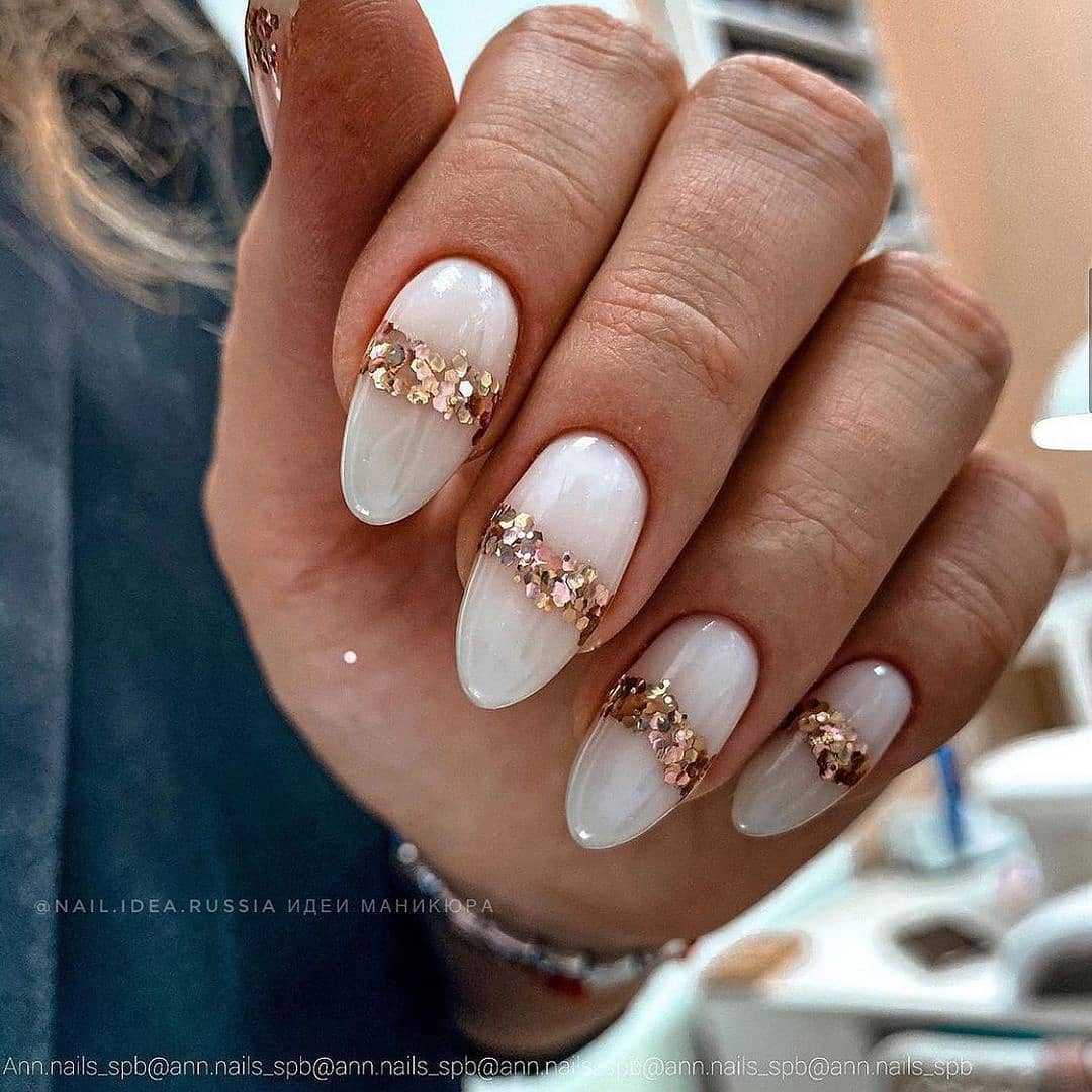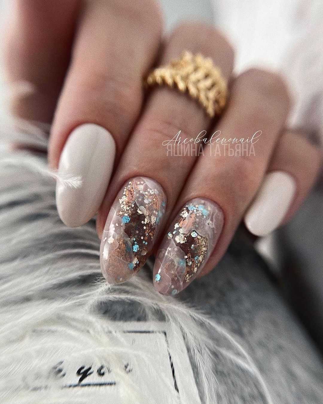 Важно то, что комбинации золотых оттенков удивительно сочетаются с любым нарядом. Независимо от времени года такой маникюр подчеркивает нарядность костюма