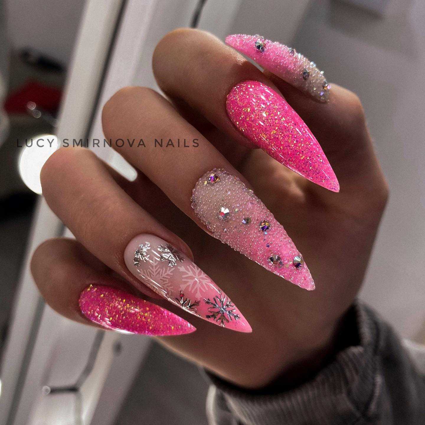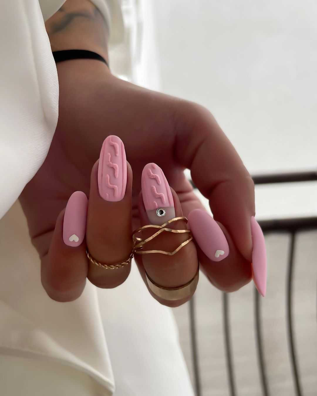 Не рекомендуется выбирать розовый маникюр 2023 без блеска, так как при оттенках лака близких к нюду издалека ручки будут выглядеть неухоженными.