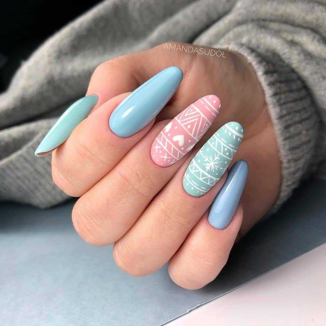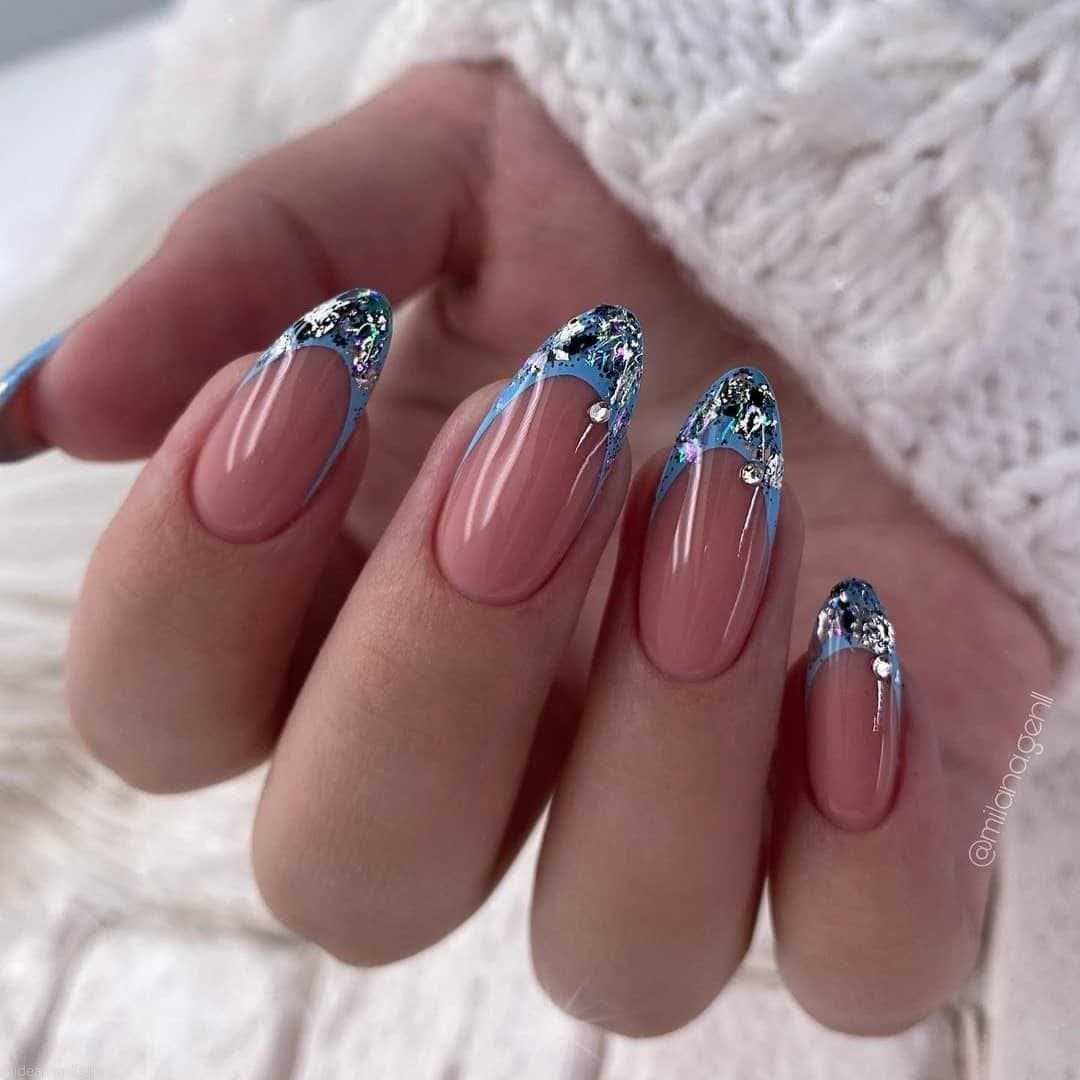 Вместе с разноцветными лаками допустимо использовать блестящий декор, который подчеркнет зимнюю тематику нейл-арта. В результате получится очень красивый маникюр с туманными разводами, красиво дополняющий январскую погоду.