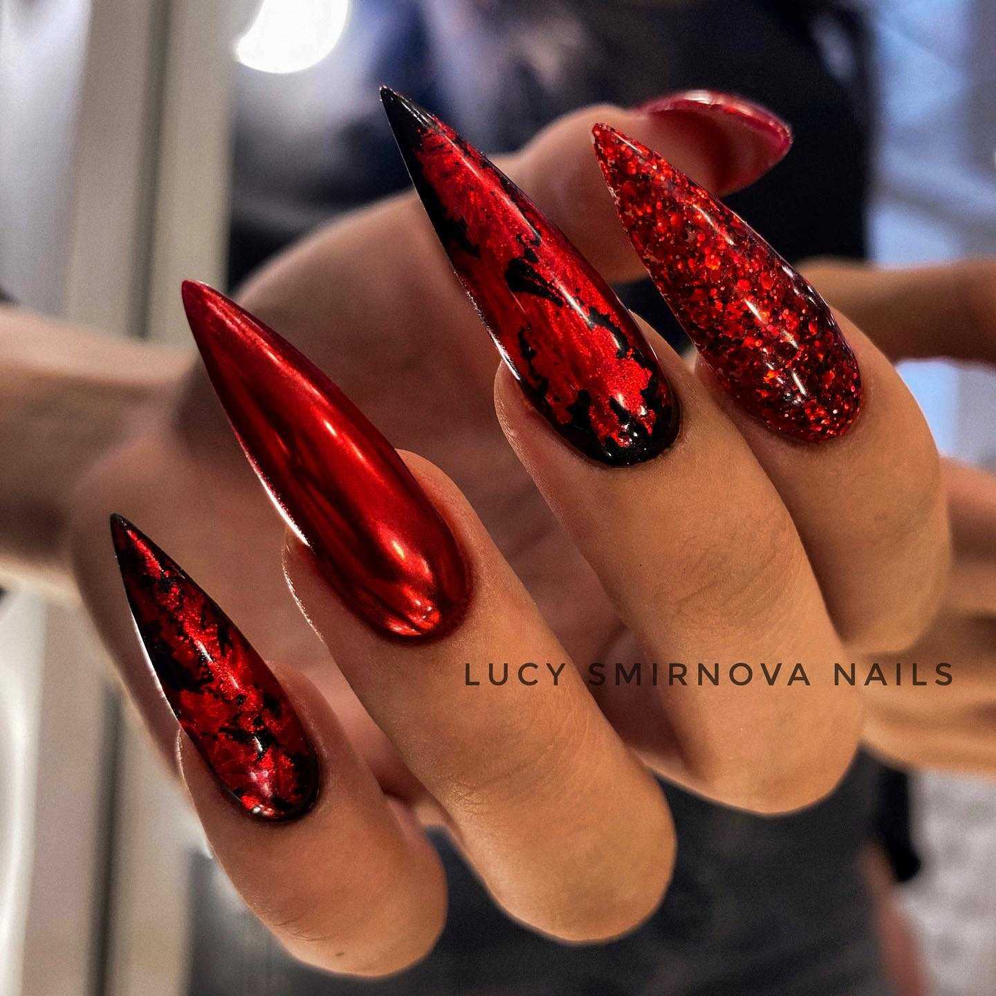 Зеркальный эффект красиво будет смотреться с бархатной текстурой насыщенных цветов. Или наоборот — серебряный бархат и темно-синее зеркало. Получится с помощью такой техники создавать действительно королевские дизайны, как раз на новогоднюю ночь.