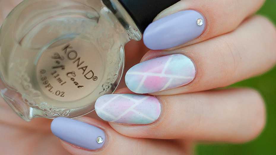 Простые, четко очерченные матовые линии или геометрические фигуры на глянцевом покрытии смотрятся эффектно и просты в исполнении. Наносятся они при помощи обычного канцелярского скотча или липкой ленты: вырезаются ровные одинаковые полоски требуемого размера, приклеиваются на влажное покрытие и резким движением руки отрываются.
