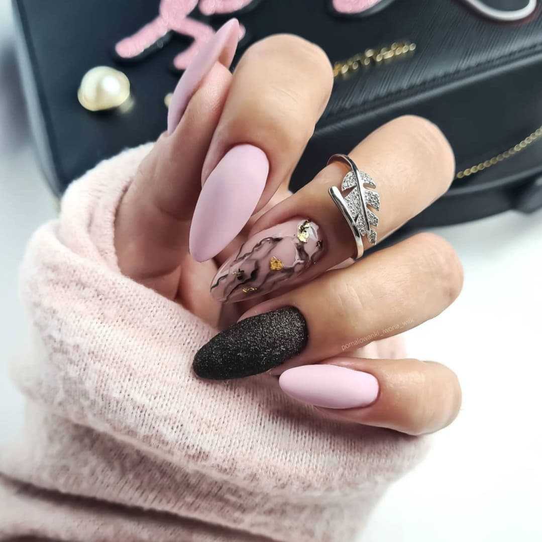 Овальна форма любит блестящий декор, который может выражаться в фольге, втирке, блестках. Все это допускается использовать на подобной длине, но не в переизбытке, чтобы не перегрузить маникюр. Выкладывать фольгу можно на одном или паре пальцев, что создаст дополнительный акцент, но не сделает внешний вид слишком броским.