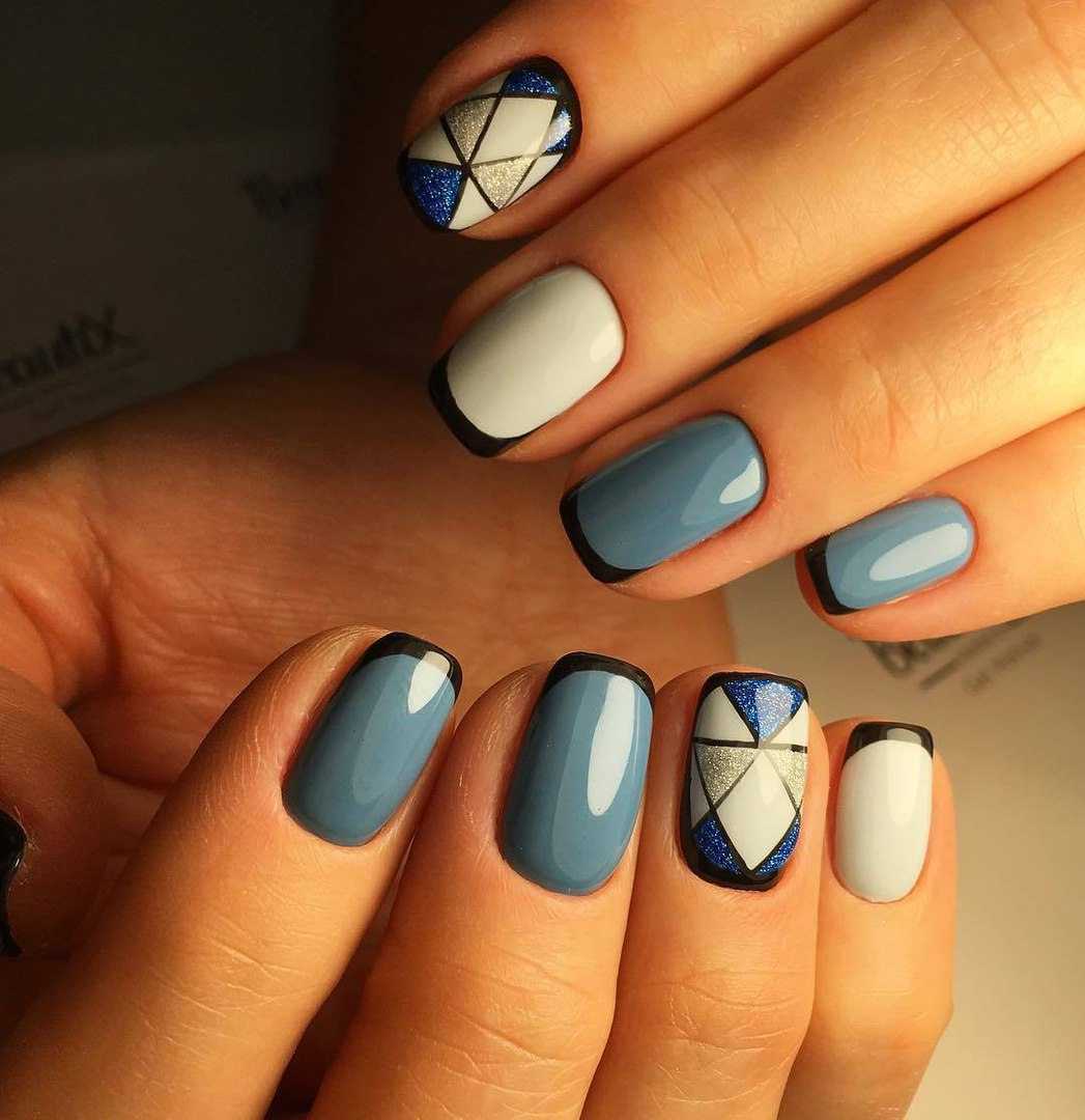Еще одно эффектное направление в области ногтевого дизайна нового сезона. Полностью на весь ноготь можно наносить цвета, которые сочетаются. Их можно разделить полосками серебристого или черного оттенка. При этом повторения рисунка на всех ноготках может и не быть. Асимметрия является трендом в нынешнем сезоне.