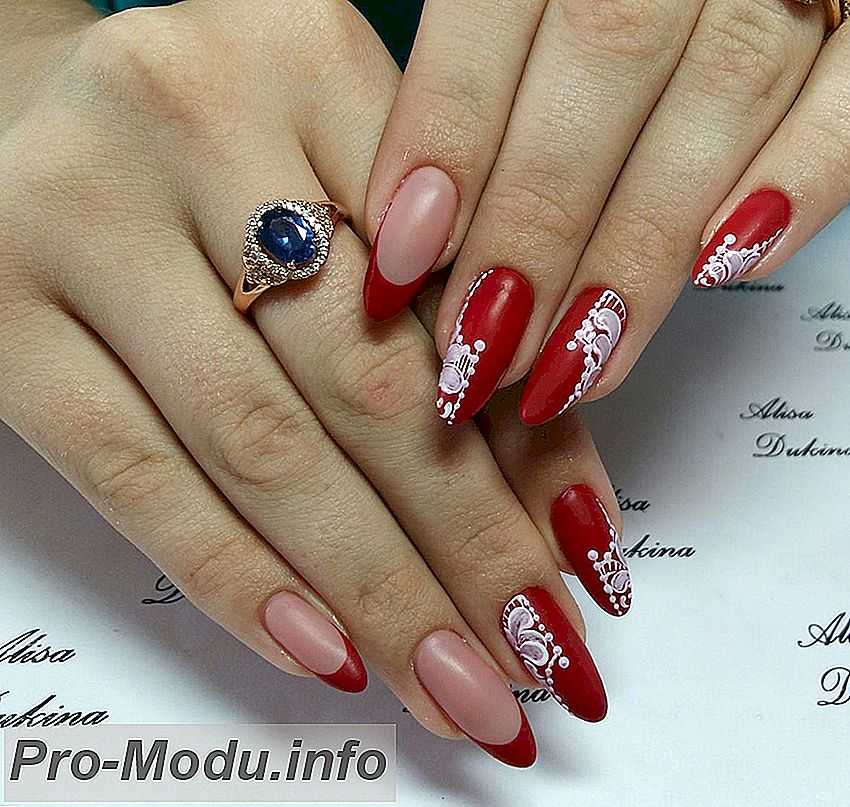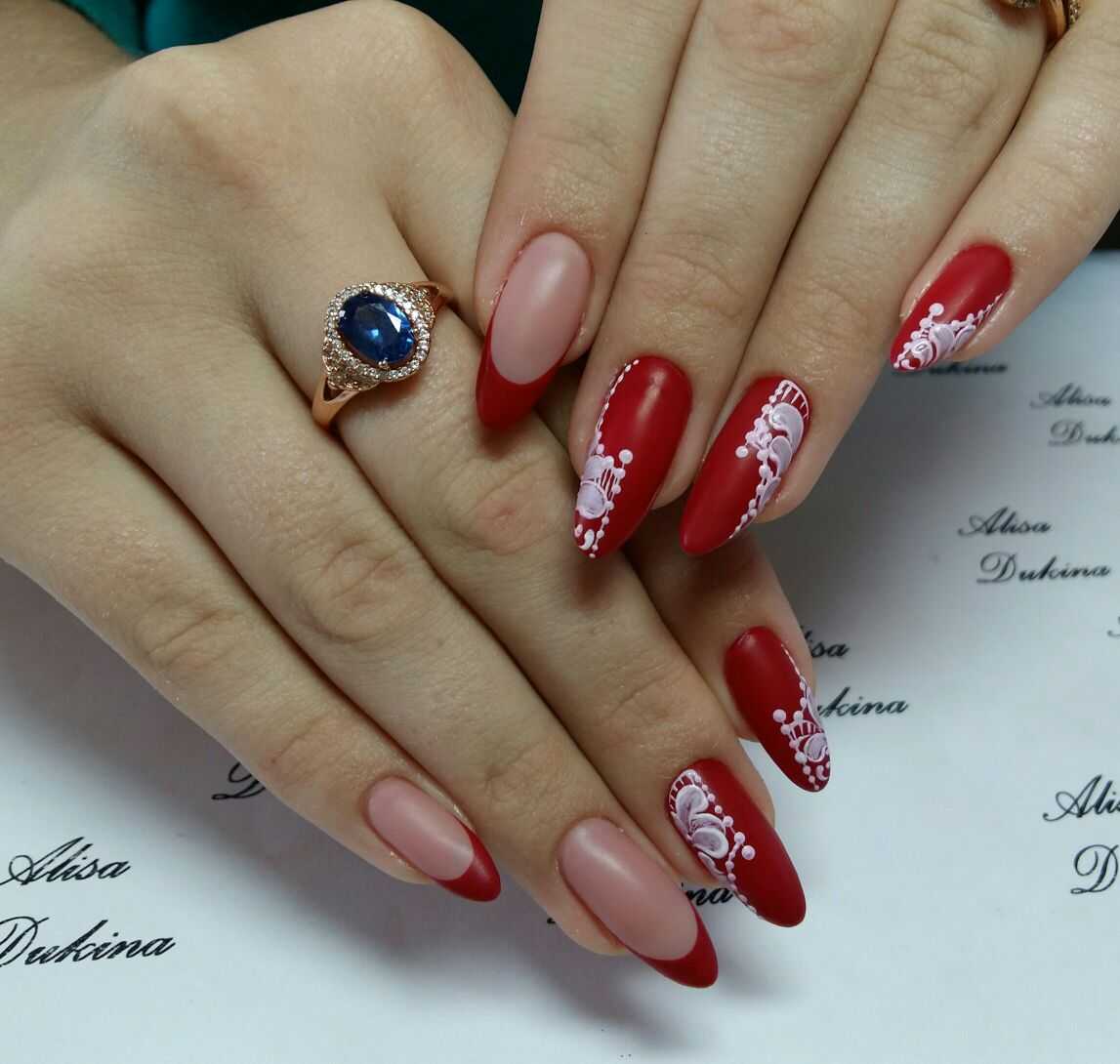 Первым в нашем списке трендовых идей выпускной маникюр с матовым покрытием, ведь именно матовые лаки создают наиболее эффектный тандем декора, техники, формы и вечернего дизайна. Матовый маникюр на выпускной в красном, фиолетовом, бордовом, черном, зеленом, синем цвете можно облагородить стразами и блесточками, украсить капельками и узорами, дополнить втирками и фольгой.